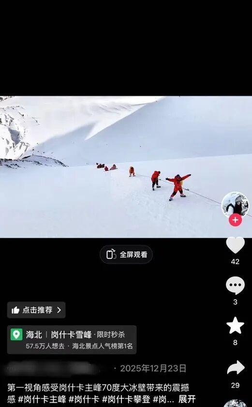 征服岗什卡雪峰源于去年以来的户外登山热潮,尤其是在王一博攀登过这座雪山后在年轻人中更火。“跟着王一博征服人生第一座雪峰”成为一种潮流,同时将岗什卡雪峰送上舆论热搜,成为年轻人争相扎堆的热门冬季旅游目的地。