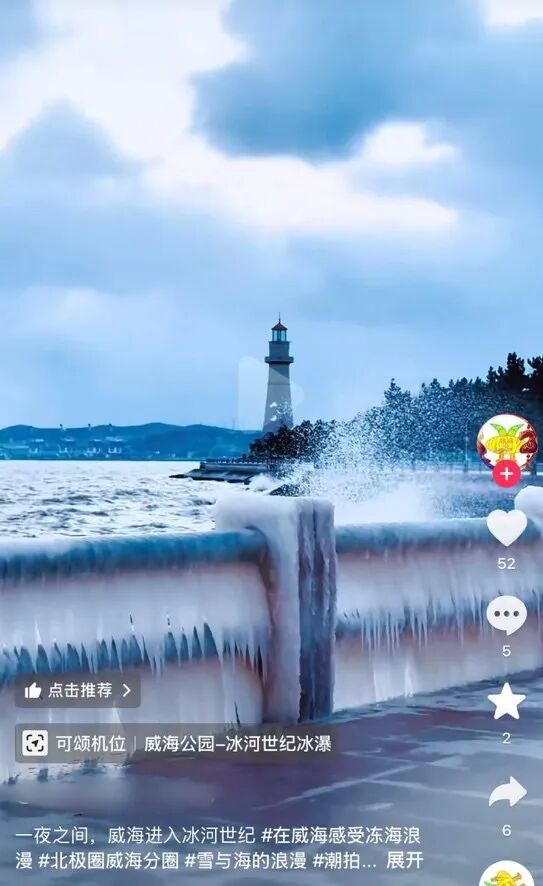 “冰河世纪”则因滨海小城山东威海冬季限定款新皮肤火爆。当肆虐的暴雪与咆哮的大海正面硬刚,却无意中在海岸线上把只有在电影中看到的“冰河世纪”完美复刻到了线下。网红打卡点布鲁威斯号沉船被暴雪衬托的更具世界末日氛围,海边被冰封的栏杆、雪地觅食的大天鹅、暴雪中的咖啡馆等一批网红打卡点出现,在社交媒体上被热议。#威海暴雪再现冰河世纪#话题登上抖音平台热搜榜TOP2,同城榜相关话题热度累计已突破4000万。