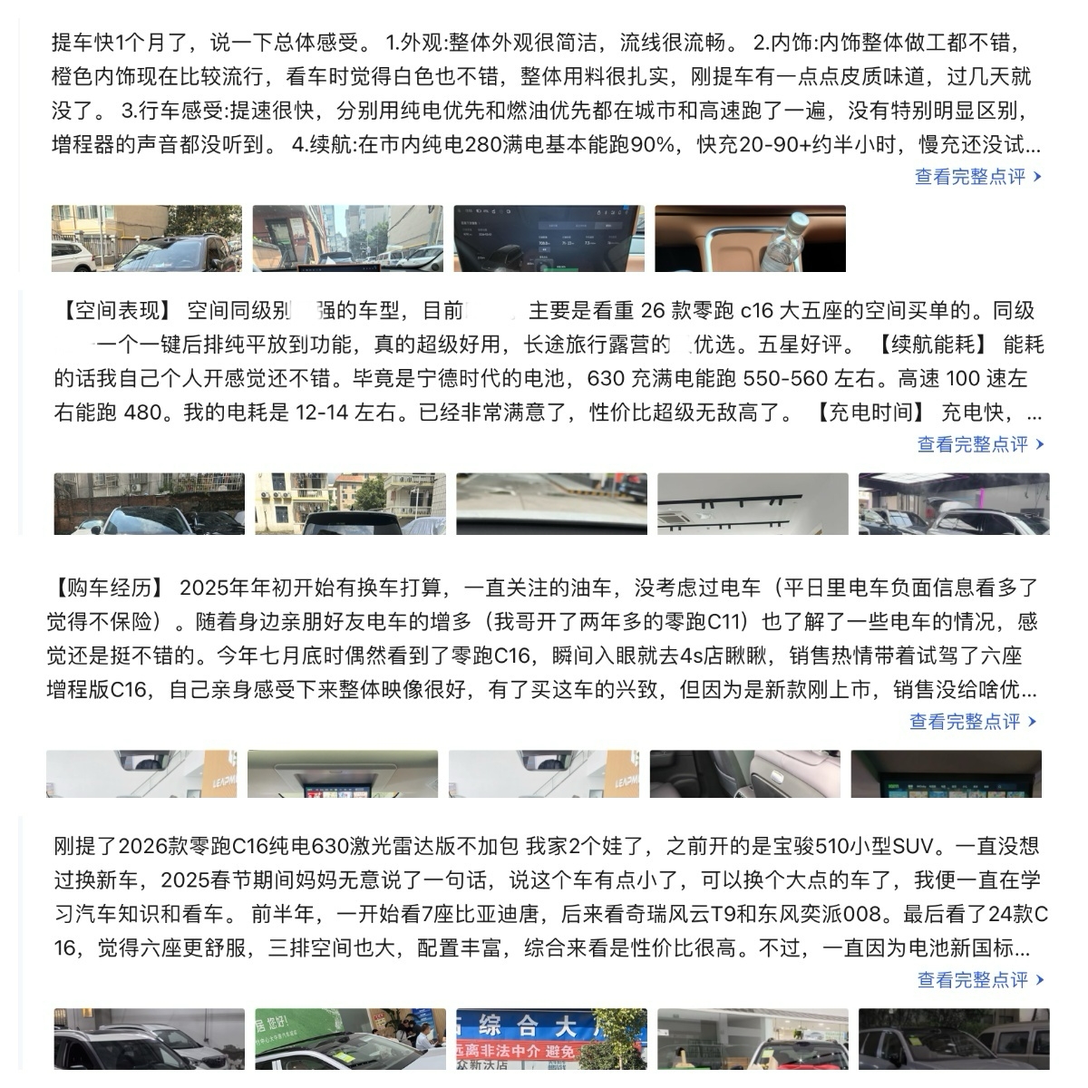 关于零跑C16:最满意的是性价比,20万以内能给到六座、800V、8295芯片和后排屏,很难找到第二家。“买来主要是为了周末带孩子出去玩,六座刚需,第三排空间比想象中大。“续航还不错,高速电耗12-14,市区纯电能跑90%,快充速度确实快”。当然,也有用户提到品牌力相对较弱,但普遍认为产品力完全超越了品牌溢价。