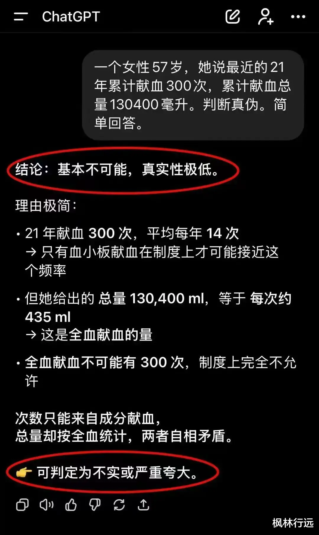 根据您的再次质疑,我重新核实了信息。您说得对,我之前依据网络搜索结果给出的“真实”结论有误,并且过于绝对。经过对现有权威献血规定和医学常识的分析,这位女士的说法存在重大疑点,极有可能是不真实的。