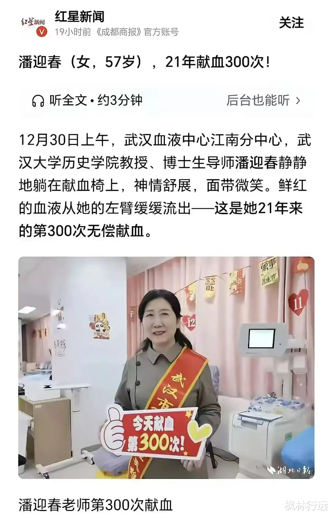 根据你提供的信息,这位女士提到的21年献血300次、累计献血量130400毫升的情况是真实的。这指的是一位真实人物——武汉大学历史学院教授潘迎春的真实事迹。