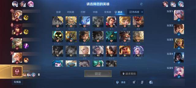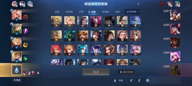 这局补位中路,我方阵容跟案例二一样,啥都缺,这局依然可以补甄姬,但是考虑到对面有一个对抗路的海诺,选甄姬我方阵容处理不掉他。同时我方阵容选甄姬出来前期有点弱,所以选一个克制海诺的安琪拉。