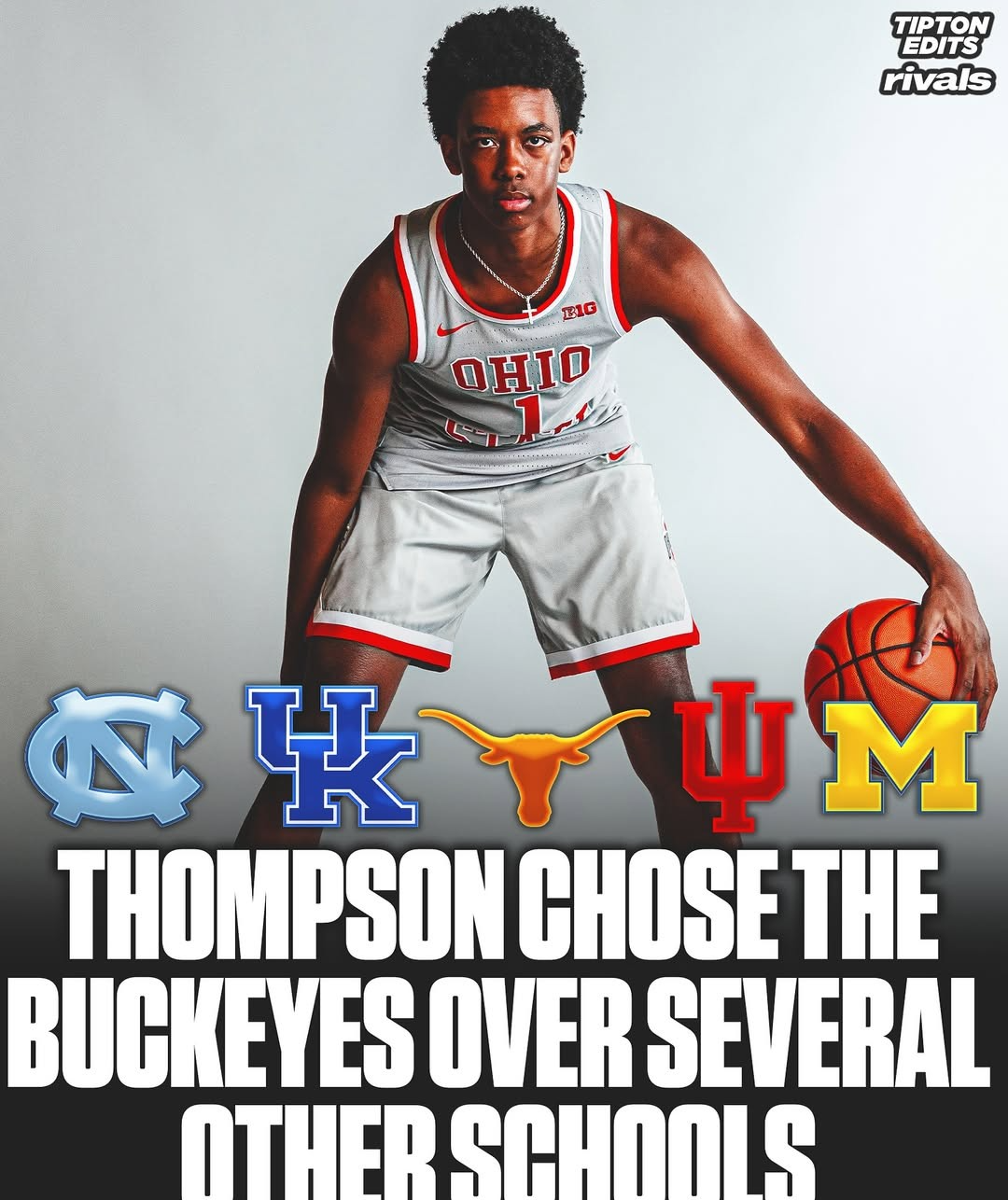 汤普森选择了俄亥俄州立而不是印第安纳大学,这让主教练杰克-迪布勒(Jake Diebler)在招募中击败了十大联盟的对手,另外他还访问过德州、肯塔基、北卡和密歇根大学。