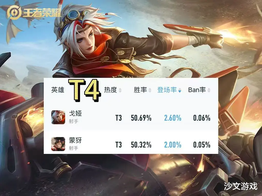 排在巅峰赛射手位登场率T4的英雄有戈娅、蒙犽,这些涌现的登场率在2%至3%之间。