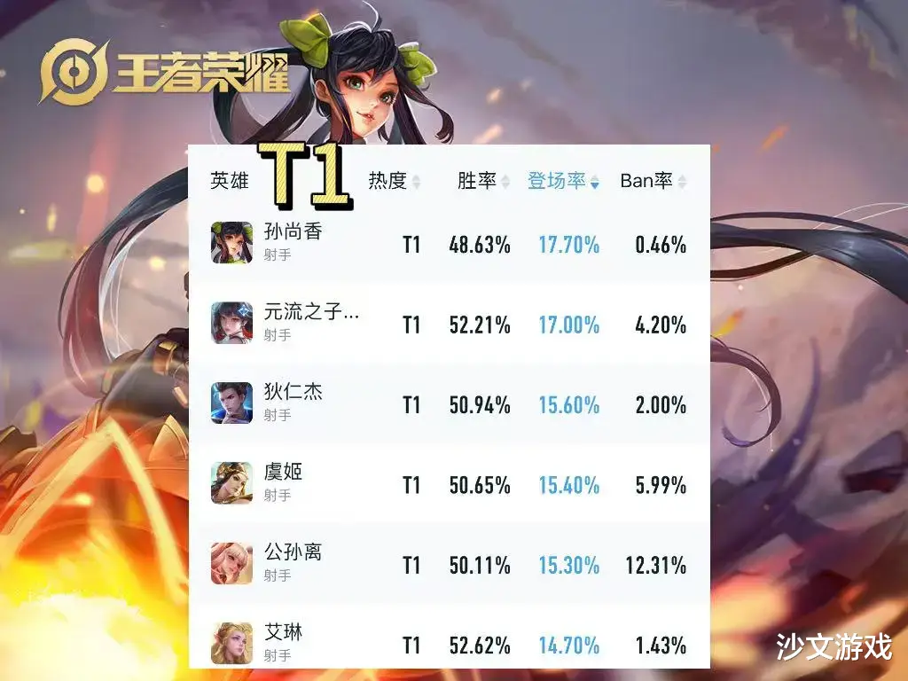 以上就是巅峰赛发育路最新的登场率T度榜,在高登场率的射手英雄中,马可波罗、孙尚香的胜率较低不建议用来上分。