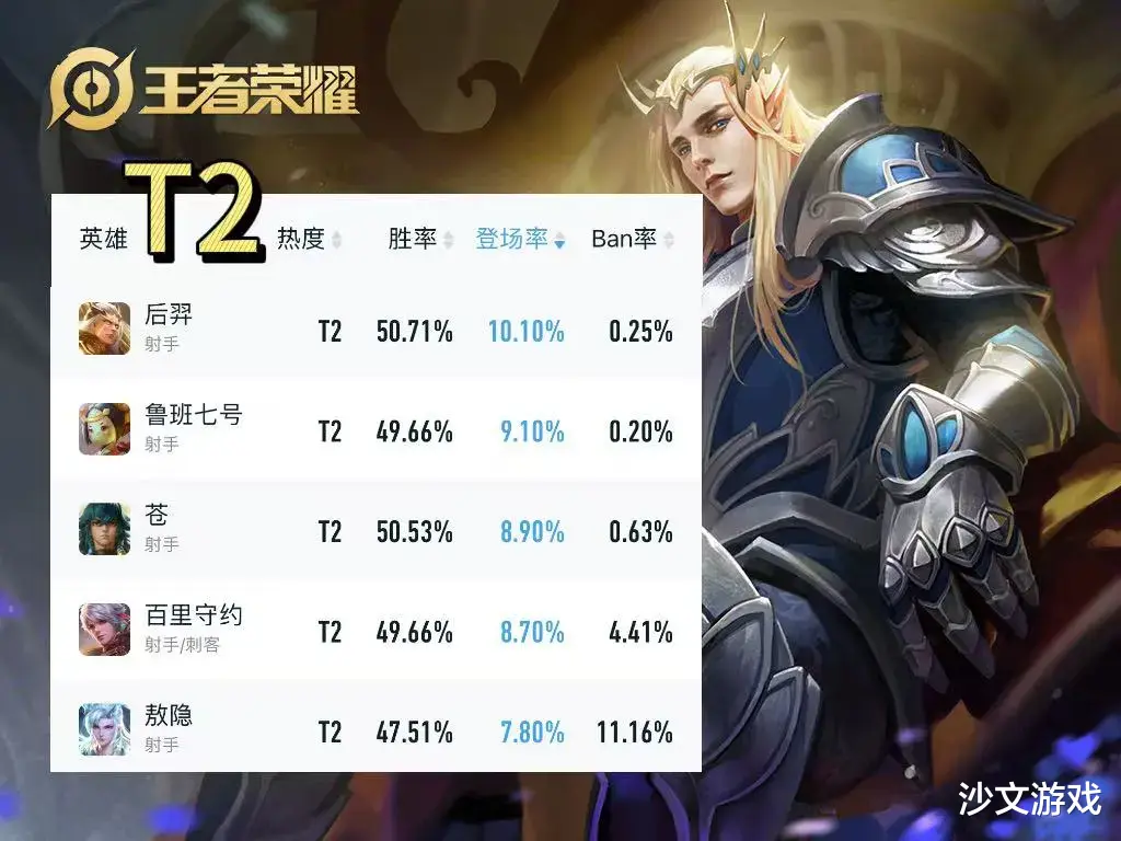 排在巅峰赛射手位登场率T2的英雄有后羿、鲁班七号、苍、百里守约、敖隐,这些英雄的登场率在7%至10%之间。