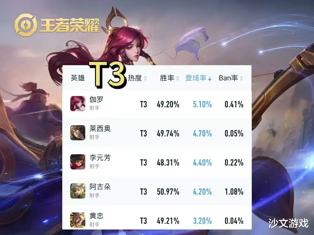 排在巅峰赛射手位登场率T3的英雄有伽罗、莱西奥、李元芳、阿古朵、黄忠,这些涌现的登场率在3%至5%之间。