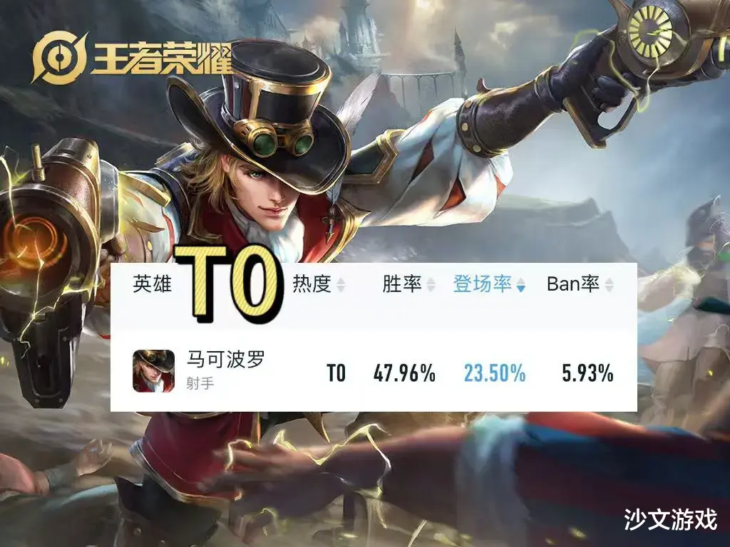 首先,排在巅峰赛射手位登场率T0的英雄只有马可波罗,他是射手中唯一登场率超过20%的英雄。他登场率与第二名相比高了将近5个百分点。