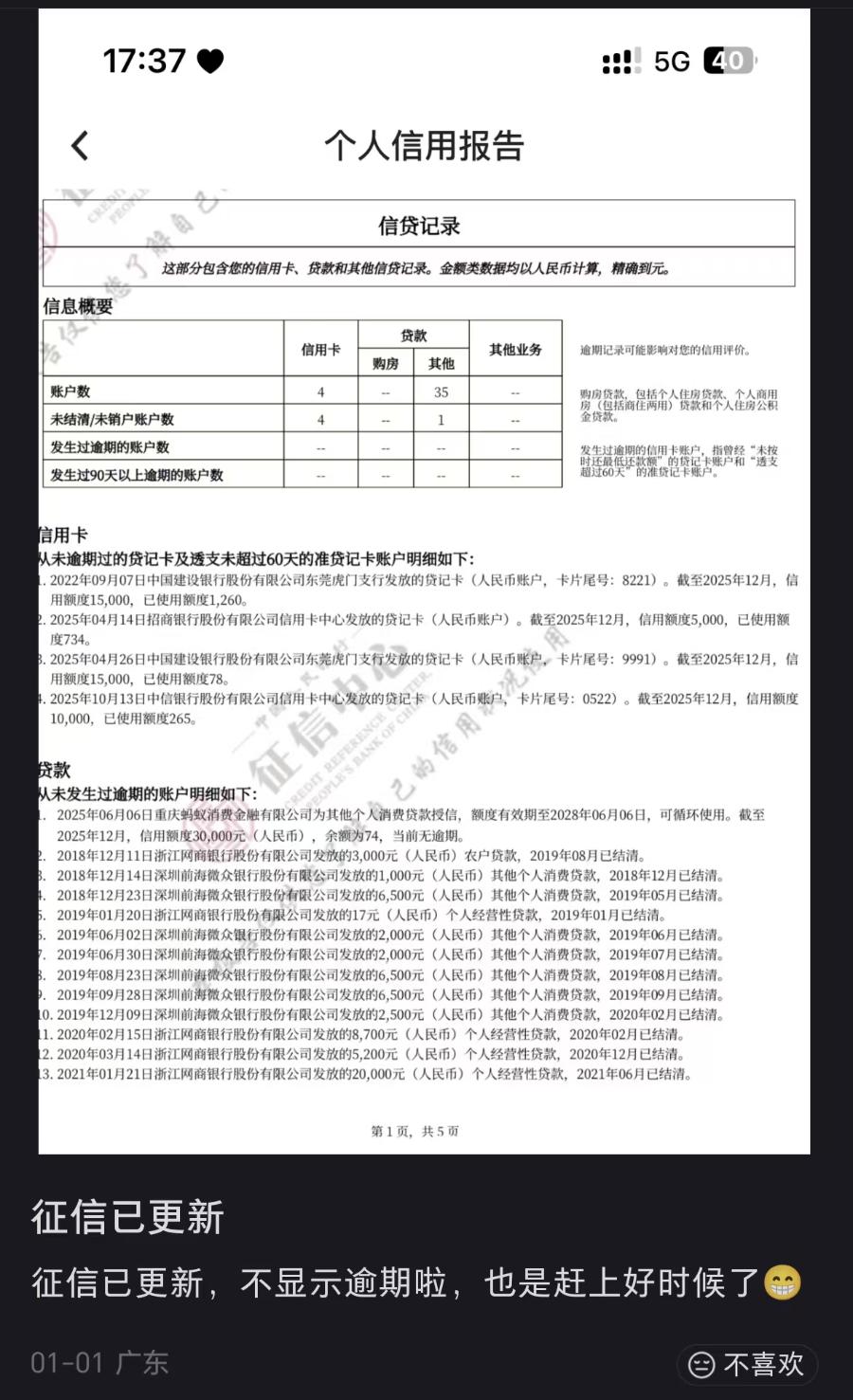 来自山西的王先生于社交平台发帖表示:“元旦早上查了一下征信确实已经没有逾期了。”来自广东的李女士也发帖称:“征信已更新,不显示逾期啦,也是赶上好时候了!”