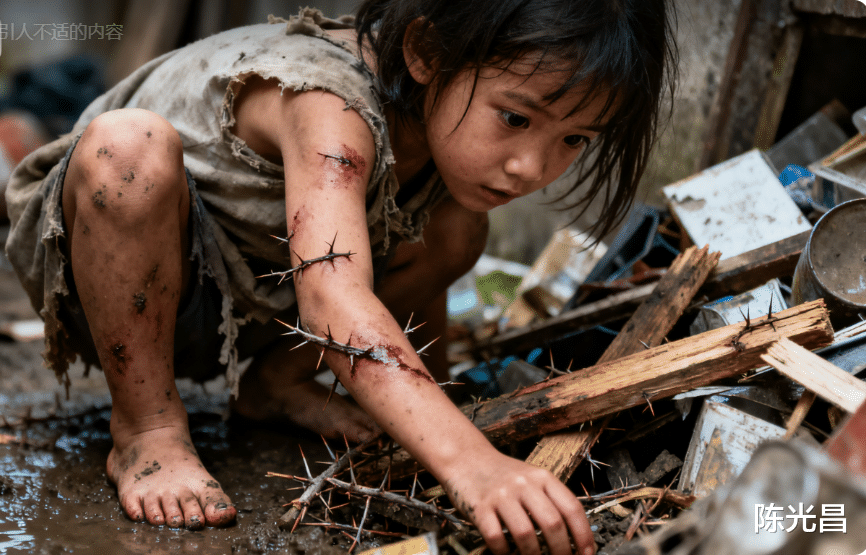 我们继续往洞中深入,昏暗的光线中,人影在洞壁上投下扭曲的轮廓。突然,一阵断断续续的啜泣声在寂静的洞中格外刺耳,循声望去,只见在一个堆满杂物的角落,一个约莫五六岁的小女孩,赤着脚,在潮湿的泥地上蹒跚而行。她身上的衣服破旧得几乎遮不住身体,胳膊上还留着几道被荆棘划伤的痕迹,干涸的血迹与泥土混在一起,显得格外触目惊心。小女孩似乎在寻找着什么,眼神中满是焦急与渴望,她时不时地蹲下身子,在杂物堆里翻找,细小的手指被木刺扎破也浑然不觉。