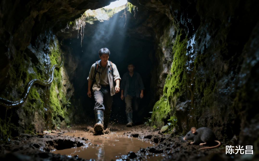 当我和陈再油踏入贫苦洞的那一刻,一股腐朽衰败的气息扑面而来,仿佛时光在这里停滞,只剩下无尽的沧桑与困苦。 洞中光线昏暗,只有几缕微弱的光线从洞顶的缝隙中透进来,勉强照亮着这个狭小的空间。潮湿的水汽凝结在洞壁上,顺着布满青苔的石壁蜿蜒而下,在地面汇聚成一个个浑浊的水洼。霉味混合着不知名的酸腐气息,如同一双无形的手,紧紧扼住喉咙。地面坑洼不平,到处都是积水和泥泞,每走一步都要小心翼翼,生怕滑倒。陈再油的登山靴陷入泥潭发出 “噗嗤” 声响,惊起角落里蜷缩的几只老鼠,它们窸窸窣窣地窜进黑暗中,更添几分阴森。