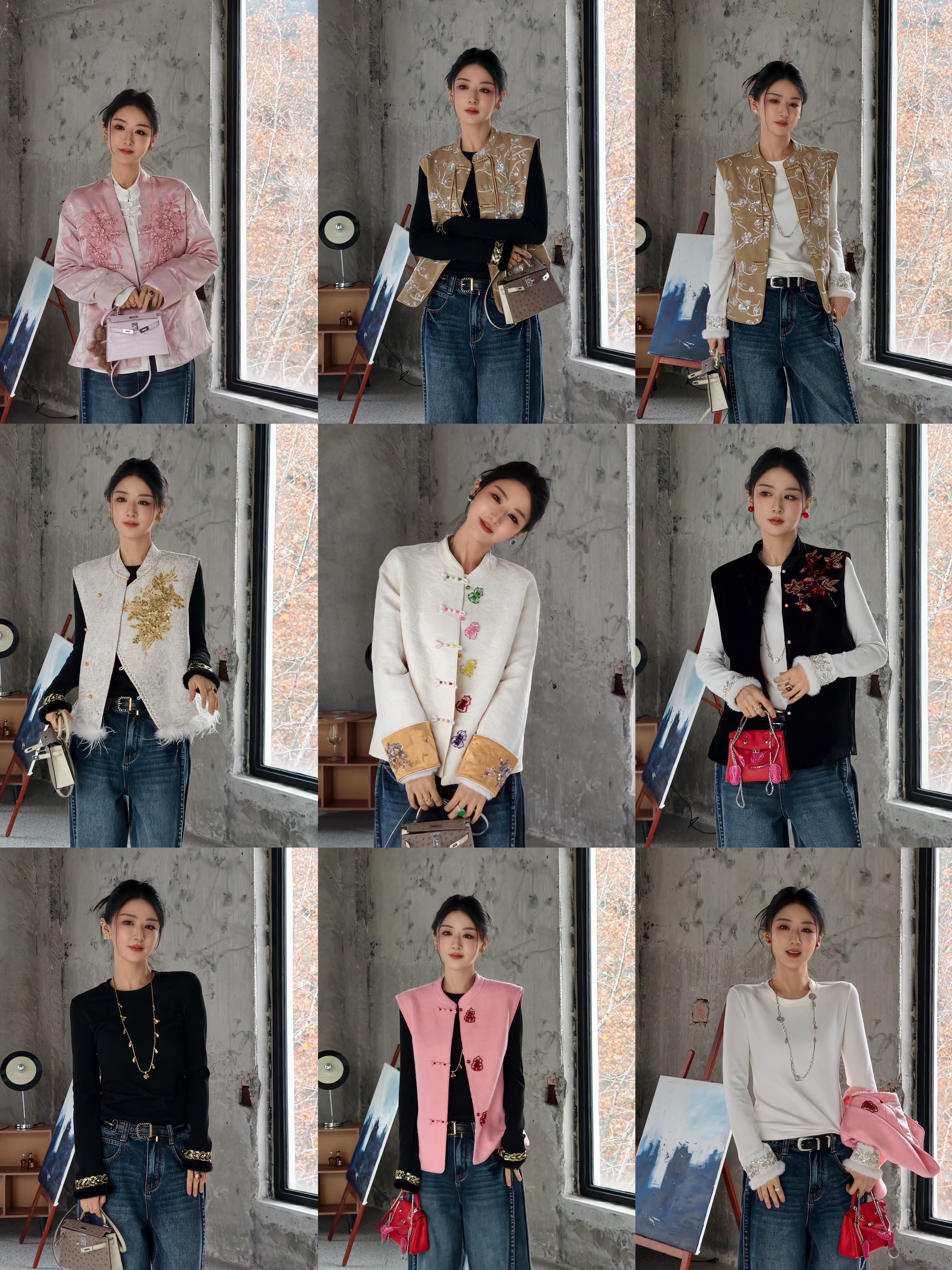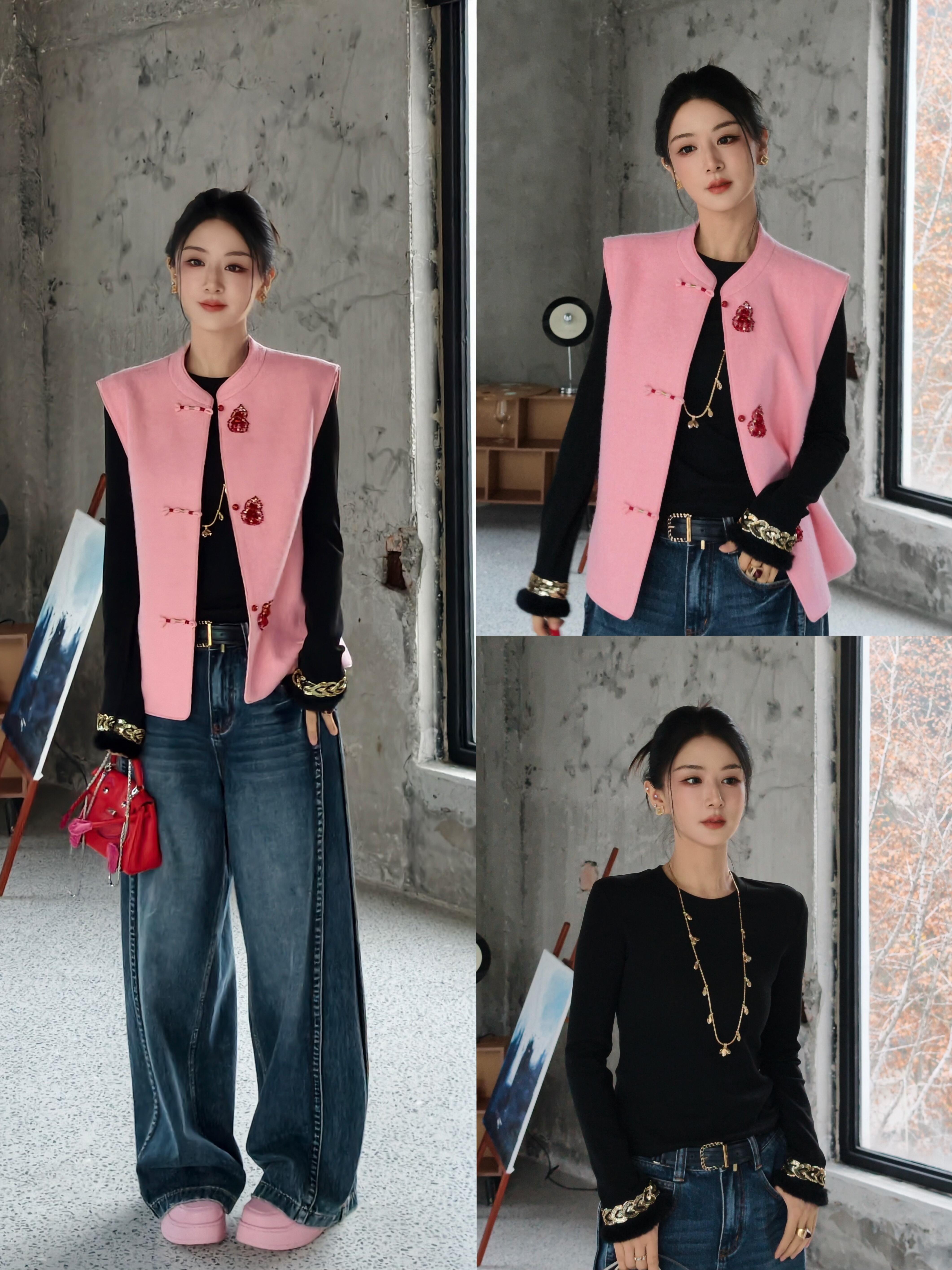 新中式马甲是解锁国风时尚的百搭利器,将东方刺绣、盘扣等传统元素与现代剪裁融合,既能凸显中式韵味,又不失利落感。单穿配修身针织,或者是简约白T恤就很好看。也可以叠搭在外套里面,实现一衣多穿。建议挑选有包容性的直筒设计,还能修饰肩颈线条、优化身材比例。