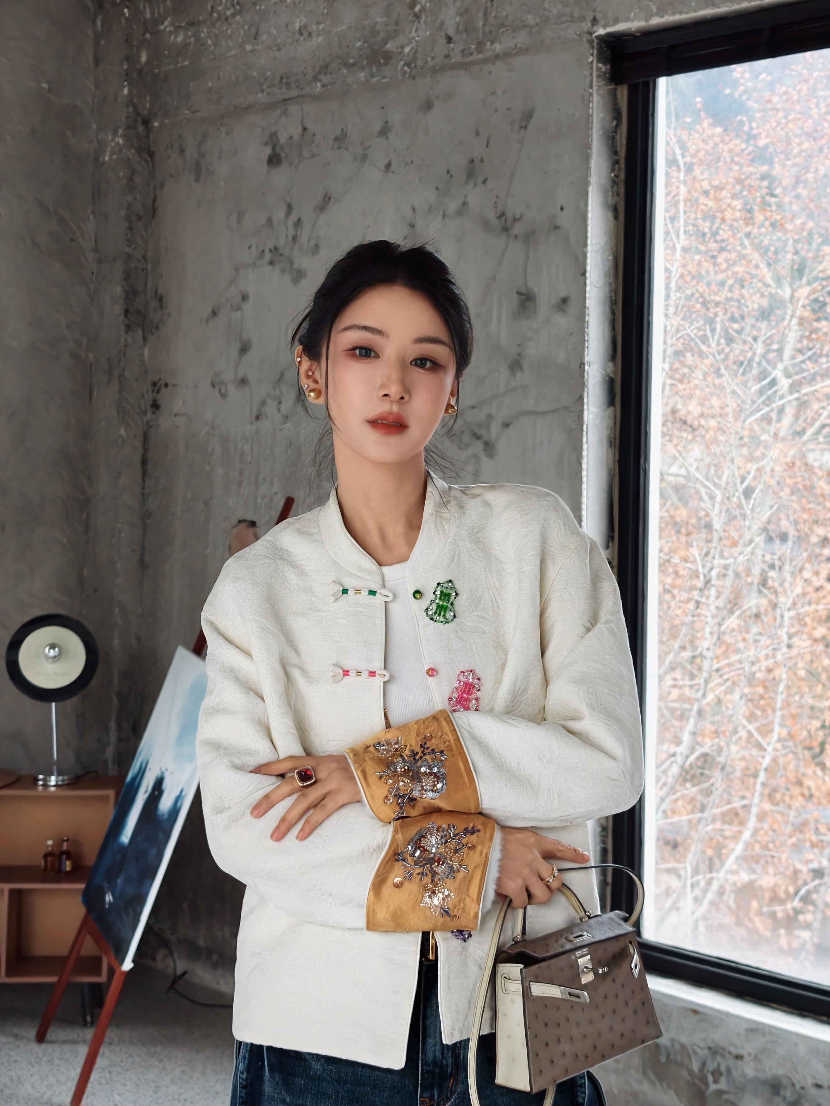 不得不佩服薇娅的选款思路,把国风与现代时尚完美融合。外套大多是简约利落的裁剪,自带慵懒氛围。领口、胸前、或者是袖口,加入刺绣、盘扣、玉石扣等1~2个中式元素,既能彰显东方雅致韵味,又能包容身形、修饰线条。比如这里的白色圆领外套,以及休闲风的牛仔夹克,融合了新中式元素后,减龄又气质。