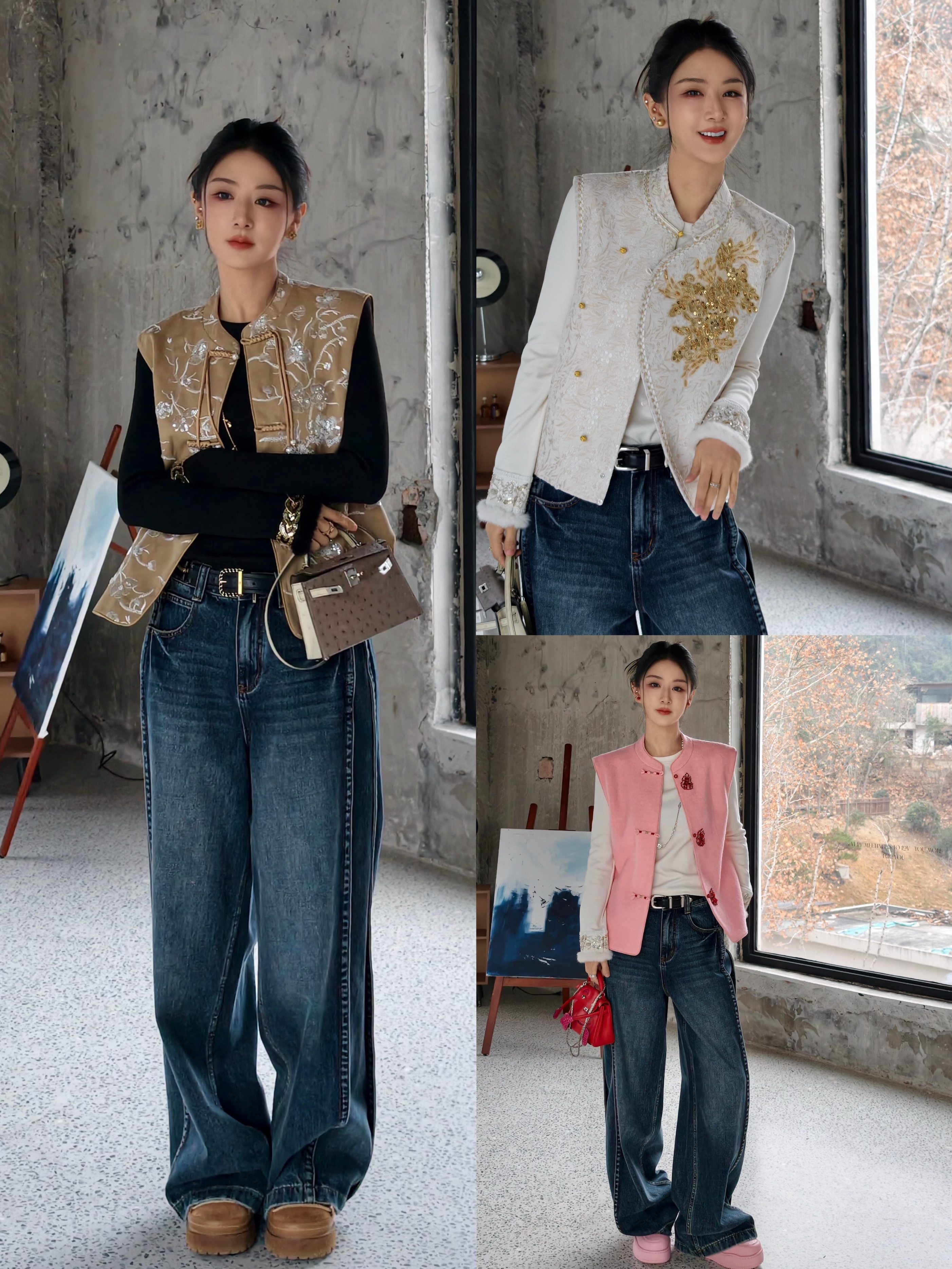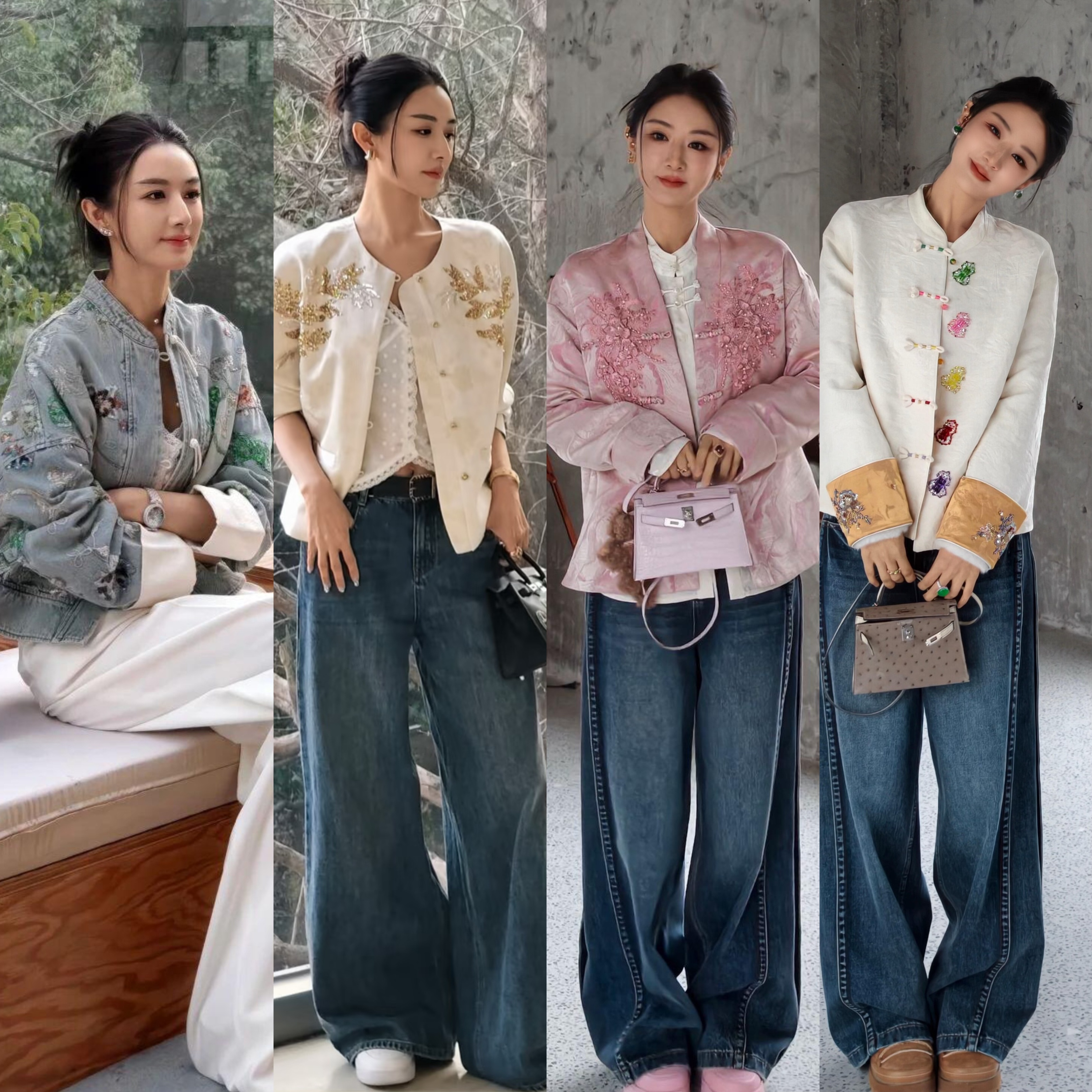 薇娅几乎所有新中式造型,都离不开“阔腿牛仔裤”这个万能搭档。重工刺绣的中式马甲、提花工艺的中式外套,下装永远是深蓝色阔腿牛仔,“上繁下简”的逻辑让视觉重心集中在中式元素上,牛仔的随性又消解了中式造型的仪式感。