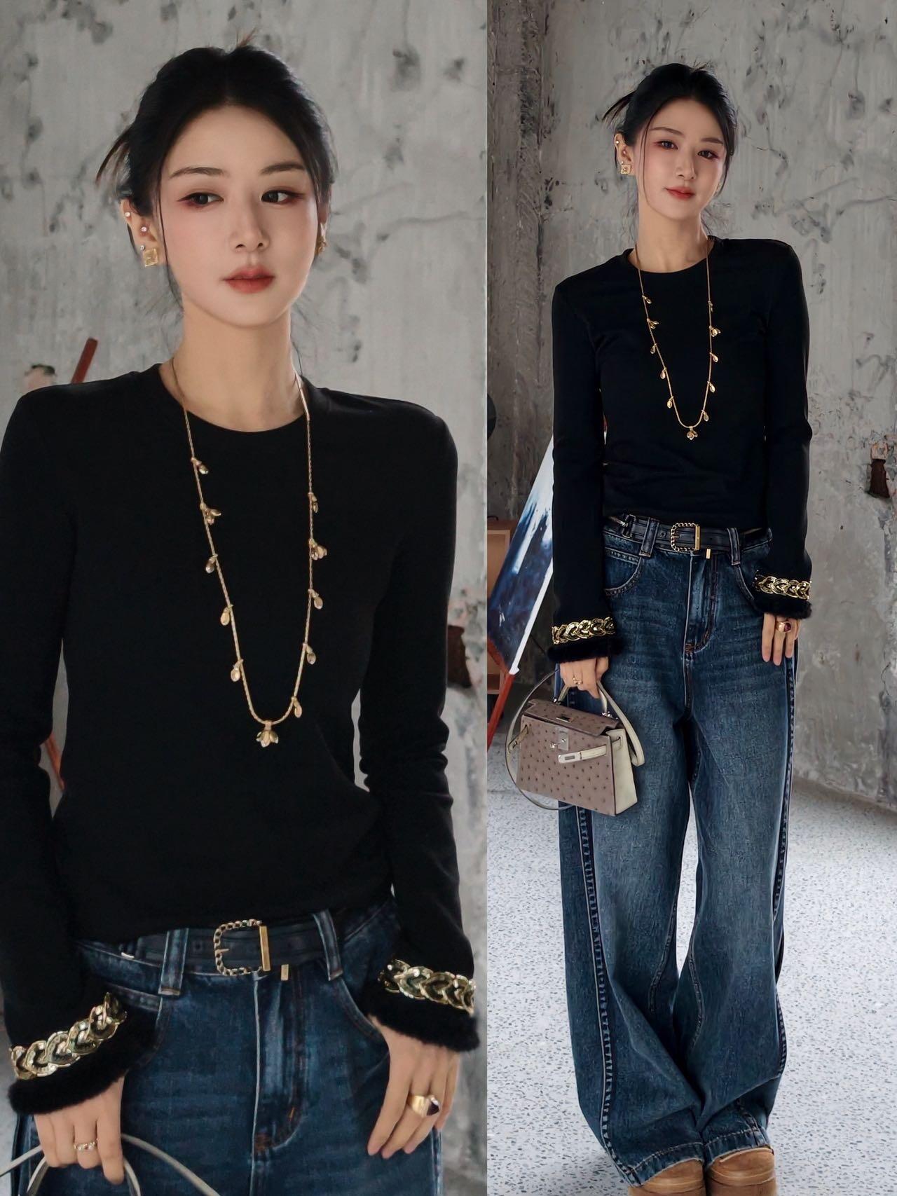 同时她注重“软硬平衡”,中式单品的柔软精致,与牛仔的硬挺形成对比,内搭则选择黑色紧身衣、白色针织衫这类基础款,避免风格冲突,让造型既优雅又自在,增添了实用性。
