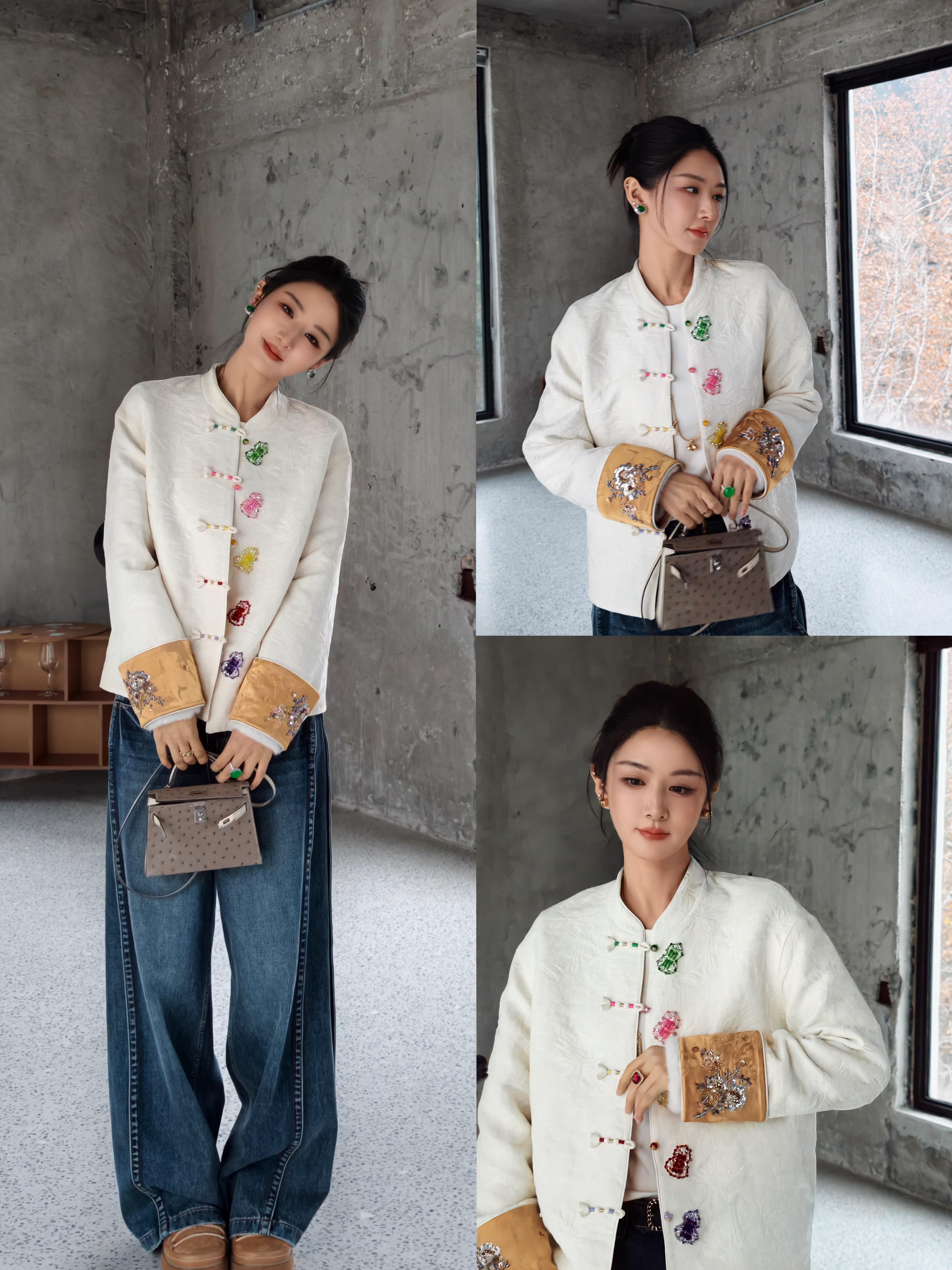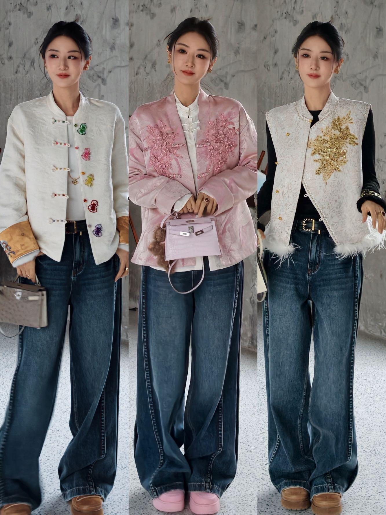 很多姐妹一穿新中式就显土,就是在搭配上吃了亏。不一定要全套all in,日常出街更推荐松弛感的搭配原则,用牛仔裤中和新中式的端庄贵气,还更减龄。