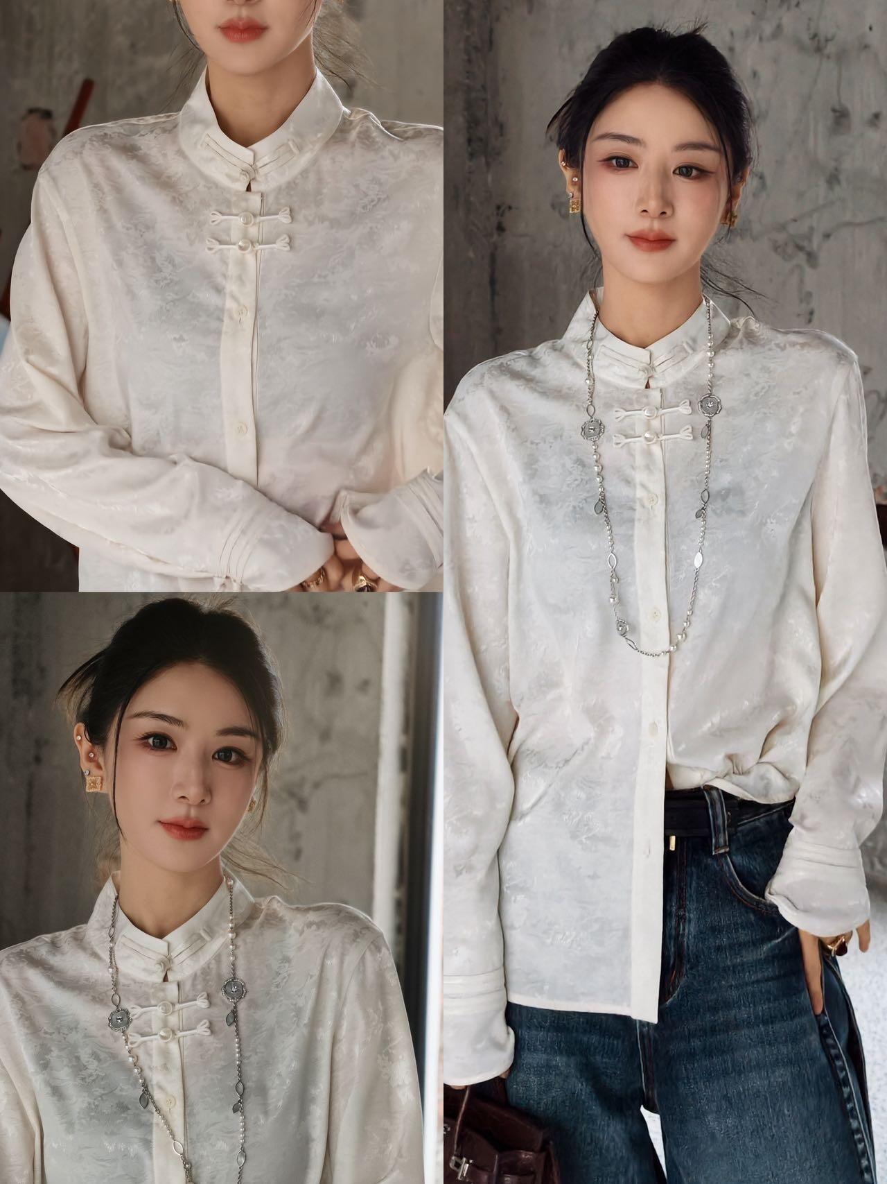 新中式衬衫可以作为国风的入门款,不用太夸张,从经典白色入手,百搭不出错。比如这里的白色暗纹提花衬衫,立领盘扣设计很优雅,搭配牛仔裤或半身裙都能穿出东方韵味。
