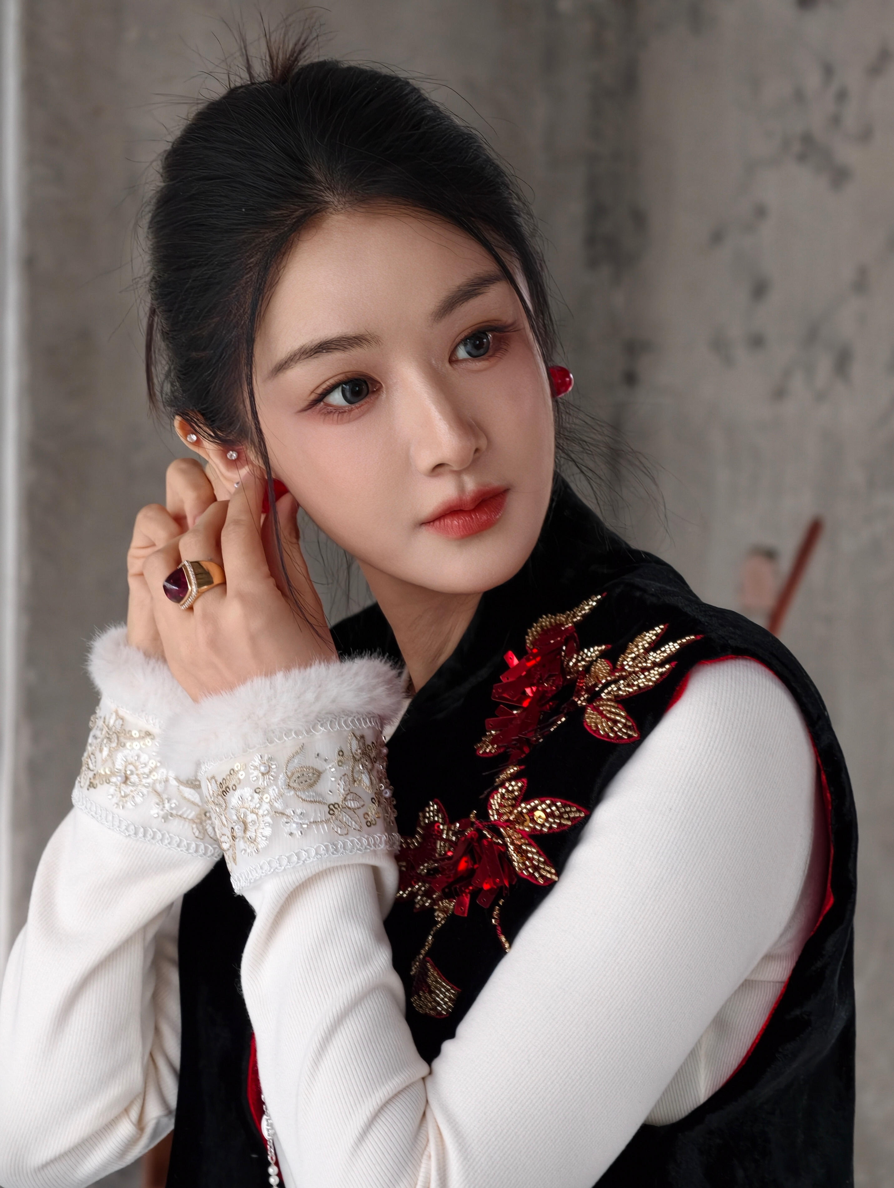 项链、耳钉、戒指等首饰,也是穿搭中的亮点。黑色金丝绒马甲太沉闷,红珠耳饰呼应黑金马甲刺绣,戒指也是黑金配色,完美呼应穿搭。这些细节不抢镜,却让精致感拉满。