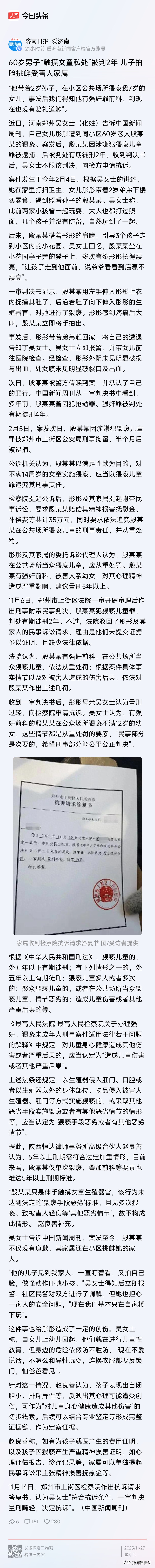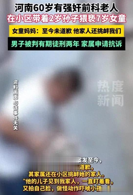 必须进行严惩!河南郑州,一60岁有强奸前科老人在小区带着2岁孙子猥亵7岁女童,案发后被判猥亵儿童罪,判处有期徒刑两年,对此女童妈妈表示:至今未道歉,最令人愤慨的是,他家人还挑衅我们,申请了抗诉,要求进行严处。
