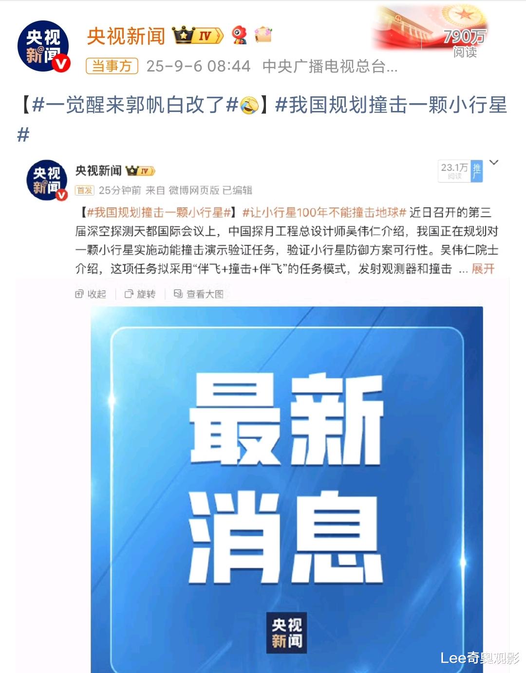 另外,近日央视报道,“我国正在规划对一颗小行星实施动能撞击演示验证任务,验证小行星防御方案可行性!”央视新闻还调侃称,“一觉醒来郭帆白改了!”