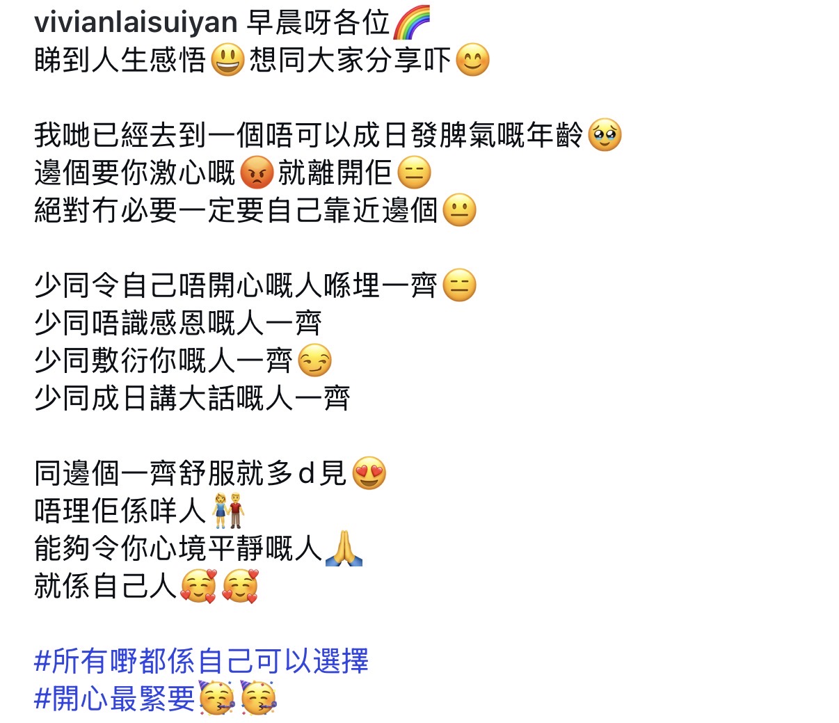 黎瑞恩在社交平台上分享自己的生活感悟,她说这些年学会了一件重要的事情,就是要远离那些带来负能量的人。
