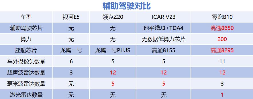 因此,在上述的产品对比中,银河E5得分3分,零跑和ICAR V23各得2分,领克Z20得1分。