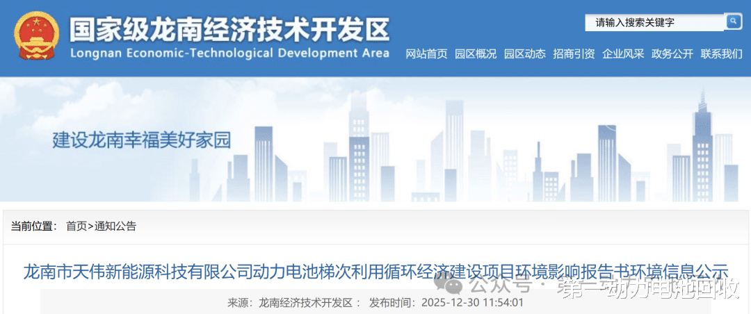 第一动力电池回收消息,近日,江西省赣州市龙南经济技术开发区发布了《龙南市天伟新能源科技有限公司动力电池梯次利用循环经济建设项目》环境影响报告书环境信息公示。