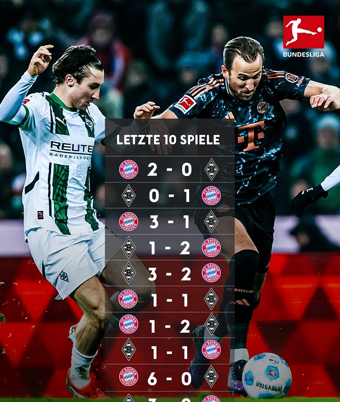 德甲层面的近12场对话,门兴也有4胜2平6负的成绩。而普鲁士公园球场的近12次德甲对决,门兴则是同拜仁各取5胜而打平了两场。