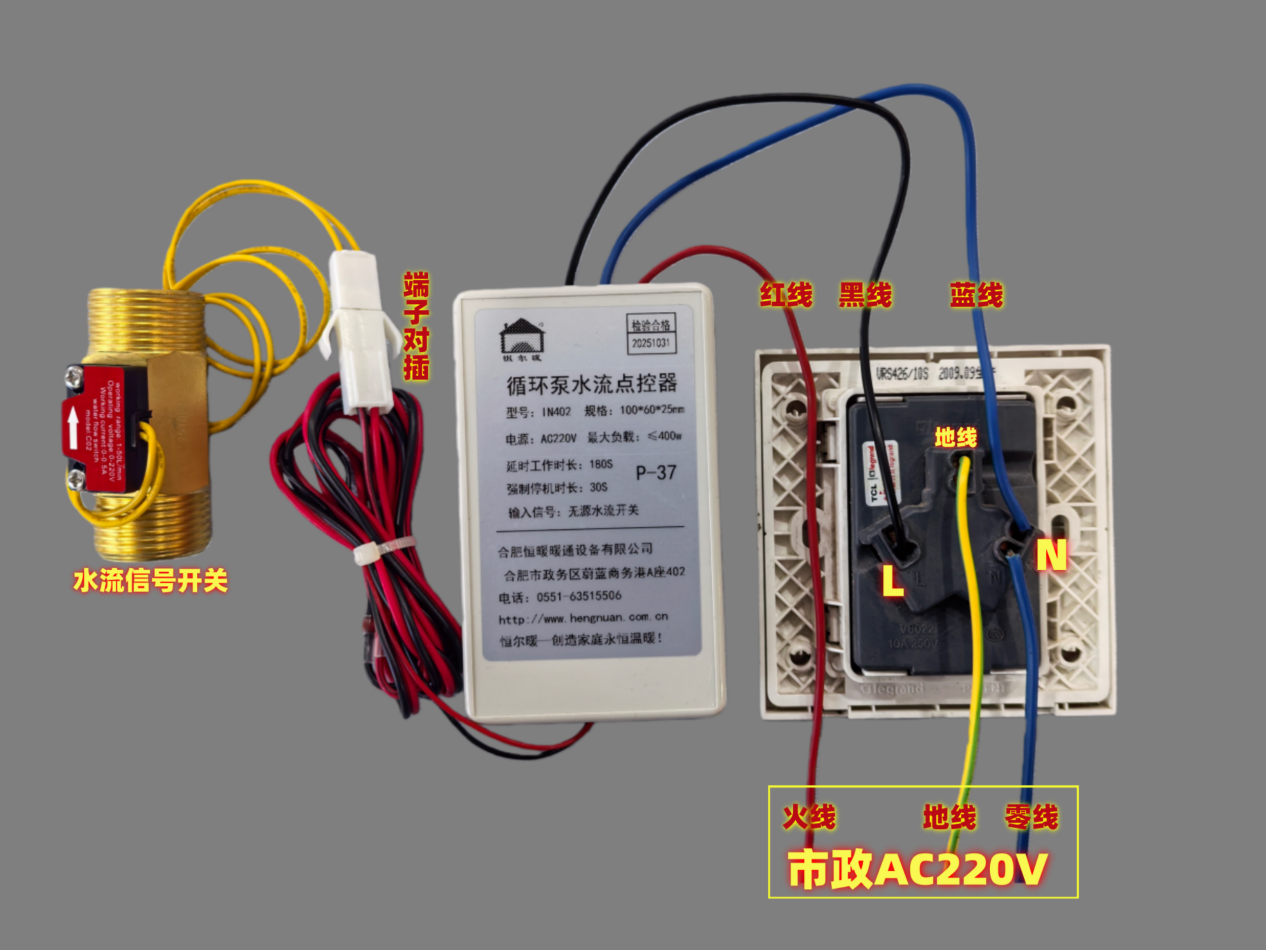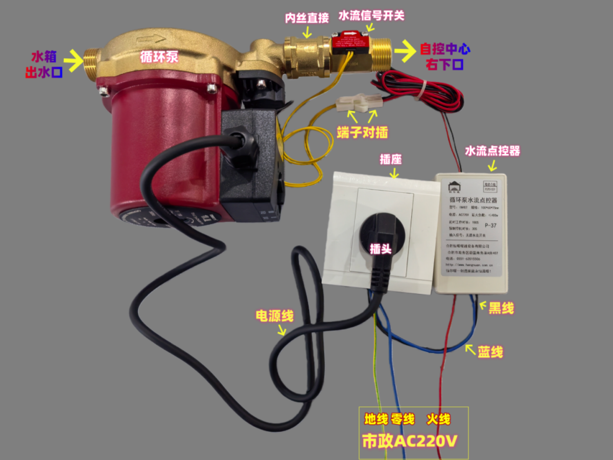 在安装循环泵处的墙面上安装一个三孔插座,循环泵水流点控器可以粘贴在边上,插座的L火线端子接水流点控器的黑色线,插座的N零线端子同时接水流点控器的蓝色线和家里的220V零线,插座的地线端子接家里的接地线,水流点控器的红色线接家里的220V火线,将水流点控器的母端子与水流开关信号公端子对插。