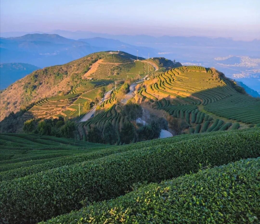 登上城郊的高山,不见茫茫云海,却邂逅了一片碧波荡漾的“茶海”。清风拂过,空气中弥漫着淡淡的、迷人的茶香,沁入心脾,令人心旷神怡,精神为之一振。青翠的茶叶上,闪烁着点点金光,梯田如诗,一半沐浴在明媚的阳光下,一半隐没在柔和的山影中,梦幻般的美景,令人如痴如醉,流连忘返。