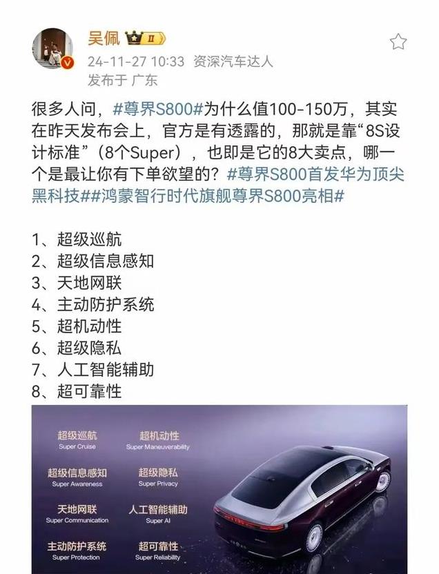 尊界S800的卖点有8个,就是超级巡航,超级信息感知,天地网联,主动防护系统,超机动性,超级隐私,人工智能辅助,超可靠性,不是你们研究的1.5T增程器,一堆看跑分的人跑到智能汽车圈还在研究发动机!