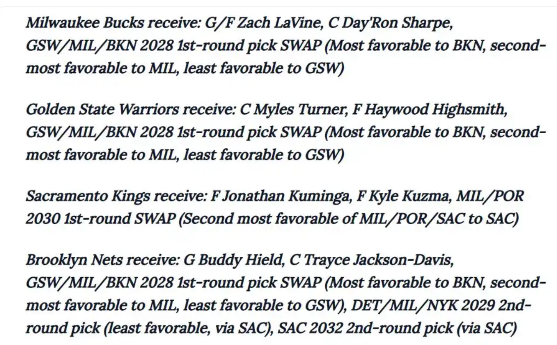 密尔沃基雄鹿得到:扎克·拉文、戴罗恩·夏普、2028年首轮选秀权互换权