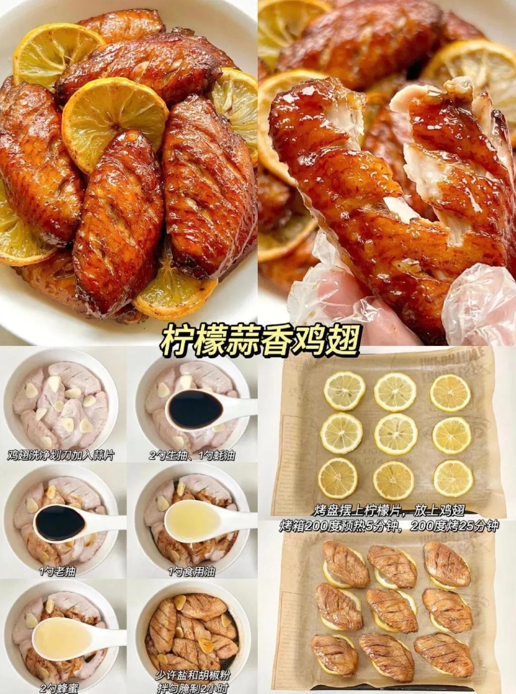 做法:鸡翅划刀,加入蒜末、柠檬汁、生抽、蜂蜜、盐、黑胡椒腌制 1 小时。将鸡翅放入预热好的烤箱,200℃烤 25 分钟,中途翻面。柠檬的清新与蒜香完美融合,酸甜解腻,颜值还超高!