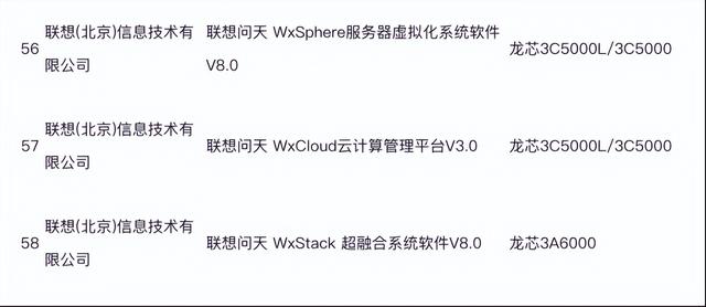通告中显示,联想此次将在其数据中心部署龙芯处理器,并运行云服务。目前,联想有三款服务器支持龙芯的处理器,包括问天WxSphere服务器虚拟化系统软件V8.0、问天WxCloud云计算管理平台V3.0,支持龙芯3C5000、龙芯3C5000L。问天WxStack超融合系统软件V8.0,适配龙芯3A6000。