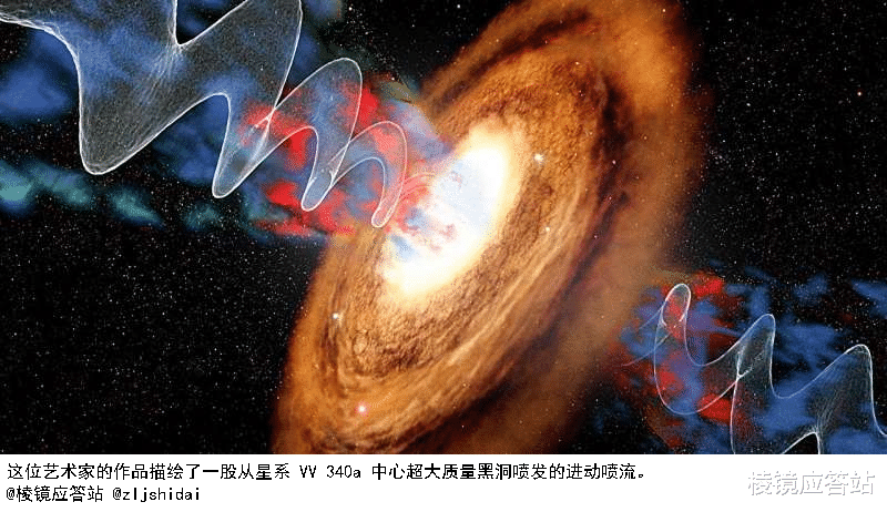 不过,当天文学家把目光投向距离地球约4.5亿光年的VV340North星系的时候,有一幕又让人惊叹又让人害怕的景象打破了这种宁静,一个超大质量黑洞正用一种很少见的摆动行为,就像失控的高压水枪似的,一个劲儿地剥离着宿主星系的生命之源。