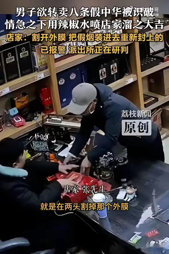 @荔枝新闻报道称,近日,一戴口罩男子欲转卖八条假中华,店主识破后男子用辣椒水喷店主,然后抱着假烟溜之大吉。