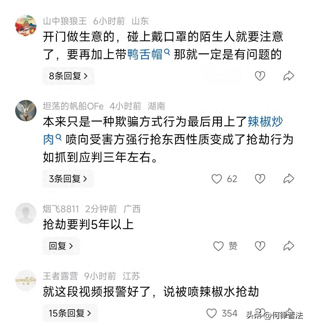 还有不少热心网友分析:本来只是一种欺骗方式行为,最后用上了辣椒炒肉喷向受害方,强行抢东西性质变成了抢劫行为,如抓到应判三年左右。