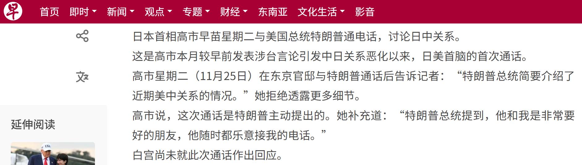 特朗普挂断中方电话后,第一时间要求与日本首相高市早苗通电话,并且一天都不愿意等,直接就安排上了,两人通话的时间是东京时间25日上午,这个时间是美国凌晨,可见特朗普的急切。