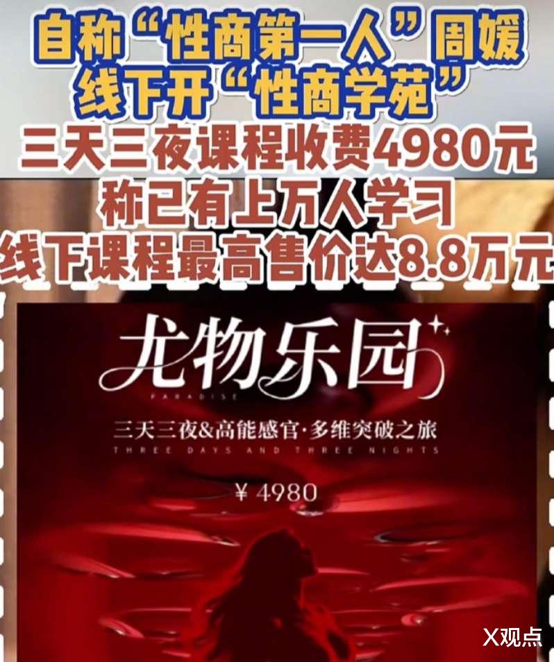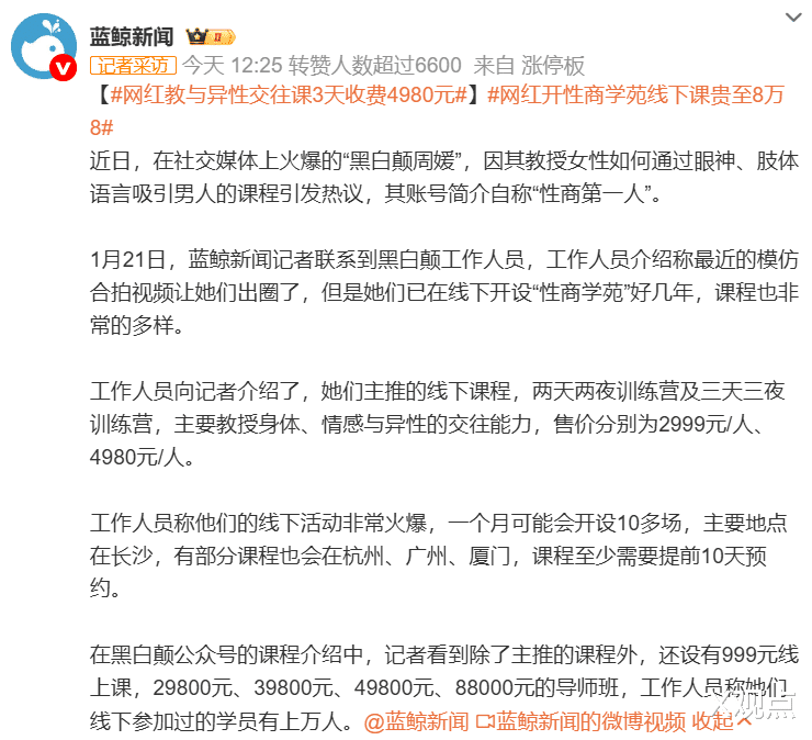 最近,一个叫"黑白颠周媛"的网红火了!她自称"性商第一人",教授女性如何用眼神、肢体语言"吸引男人"。3天线下课收费49