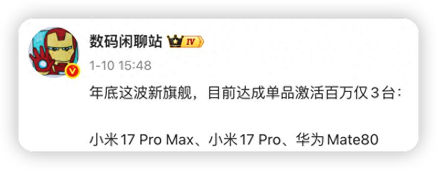 这波国产高端旗舰新机里面,小米17系列的表现无疑很不错,毕竟目前这波国产旗舰单品激活量突破100万的机型才三台,而小米17 Pro和小米17 Pro Max就占据了两个席位。