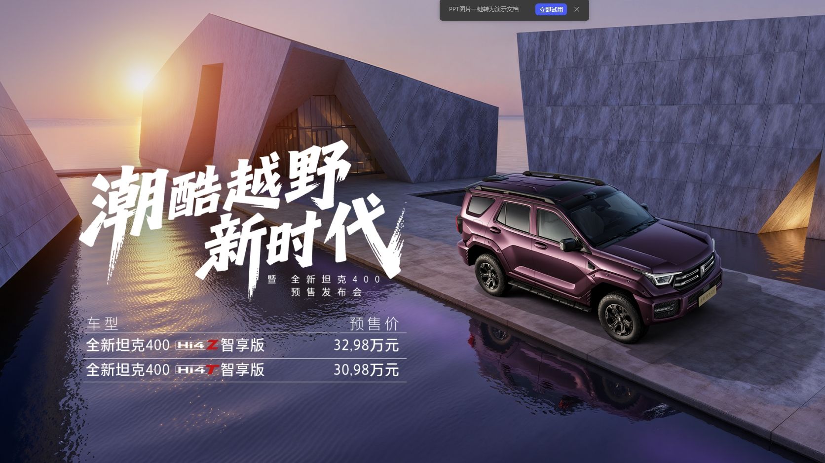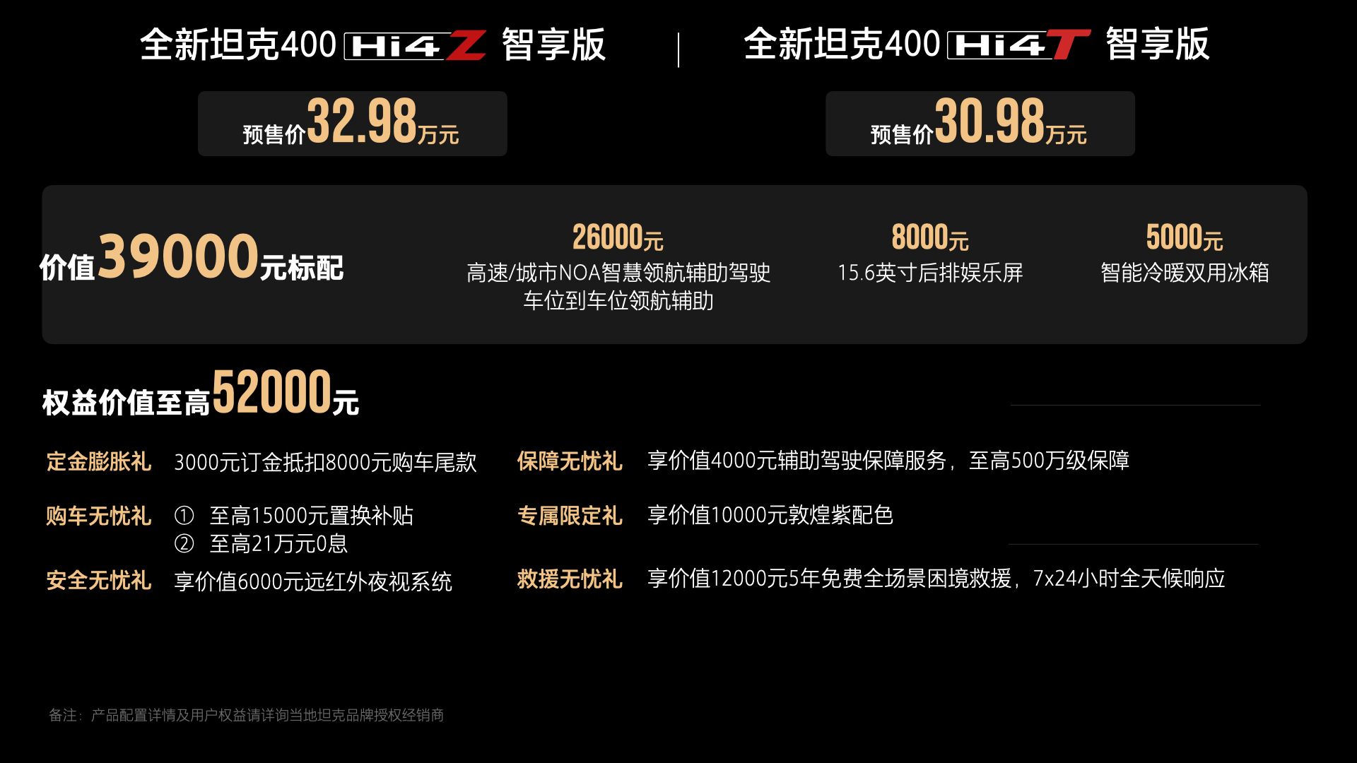 目前全新坦克400 Hi4-Z智享版、全新坦克400 Hi4-T智享版已同步开启预售,预售期间预订可享6重尊崇权益,全新坦克400以满满诚意为年轻用户体验潮酷越野带来惊喜购车优惠。