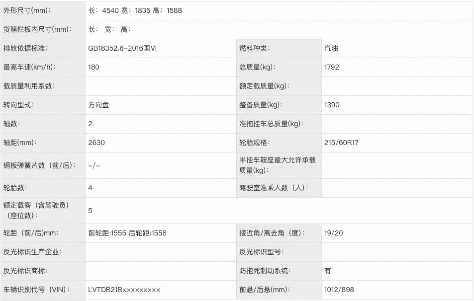 车身尺寸为4540/1835/1588毫米,轴距2630毫米,定位紧凑型SUV。动力搭载1.5T发动机,最大功率115千瓦,百公里油耗申报值为7.29升。