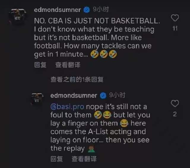 或许萨姆纳应该向杨瀚森学习怎么说话。杨瀚森刚刚去美国时也曾谈论CBA比赛强度的问题,小杨的说法是:在某些方面,CBA的对抗比NBA更激烈!