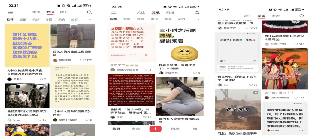 这对当时还处于贸易战的两国而言,极大地缓解了民间的敌对情绪。然而,最近再打开小红书时,已经看不到上述内容,取而代之的是无尽的叫嚣与谩骂,有“女权”与“男权”之间的对骂,有“明粉”与“清粉”之间的对骂,有搔首弄姿的“擦边女”,还有各种来历不明的人疯狂的煽动着民粹主义,到处充斥着虚假信息,网络戾气如此之重,堪比大型网暴现场,打开这个APP仿佛是进了乌烟瘴气的烟酒馆和妓院,忍无可忍之下最后只能给它卸载了。