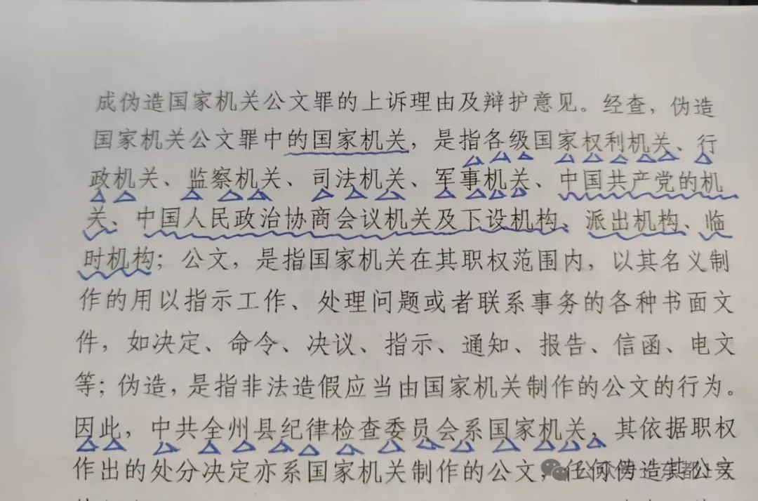 桂林市中级法院的一份《刑事裁定书》显示,“经查,伪造国家机关公文罪中的国家机关,是指各级国家权利机关、行政机关、监察机关、司法机关、军事机关、中国共产党的机关、中国人民政治协商会议机关及下设机构、派出机构、临时机构;公文,是指国家机关在其职权范围内,以其名义制作的用以指示工作、处理问题或者联系事务的各种书面文件,如决定、命令、决议、指示、通知、报告、信函、电文等;伪造,是指非法造假应当由国家机关制作的公文的行为。因此,中共全州县纪律检查委员会系国家机关。”