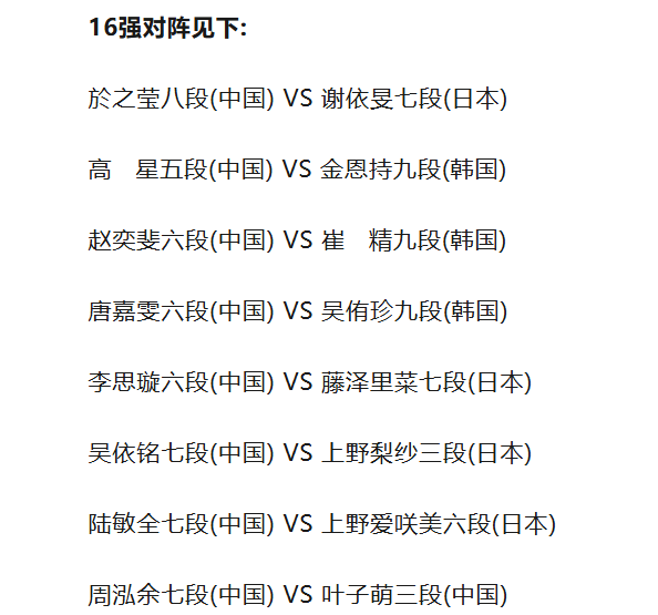 吴清源杯世界围棋公开赛首日中韩大战均1胜1负,16强中国9人包夹日韩名将!北京时间12月3日,由中国围棋协会主办的吴清源杯世界女子围棋公开赛持续进行,在经历首轮大战之后,16强免选晋级的中日韩於之莹、周泓余、崔精等8名悍将将持续向着冠军前进!