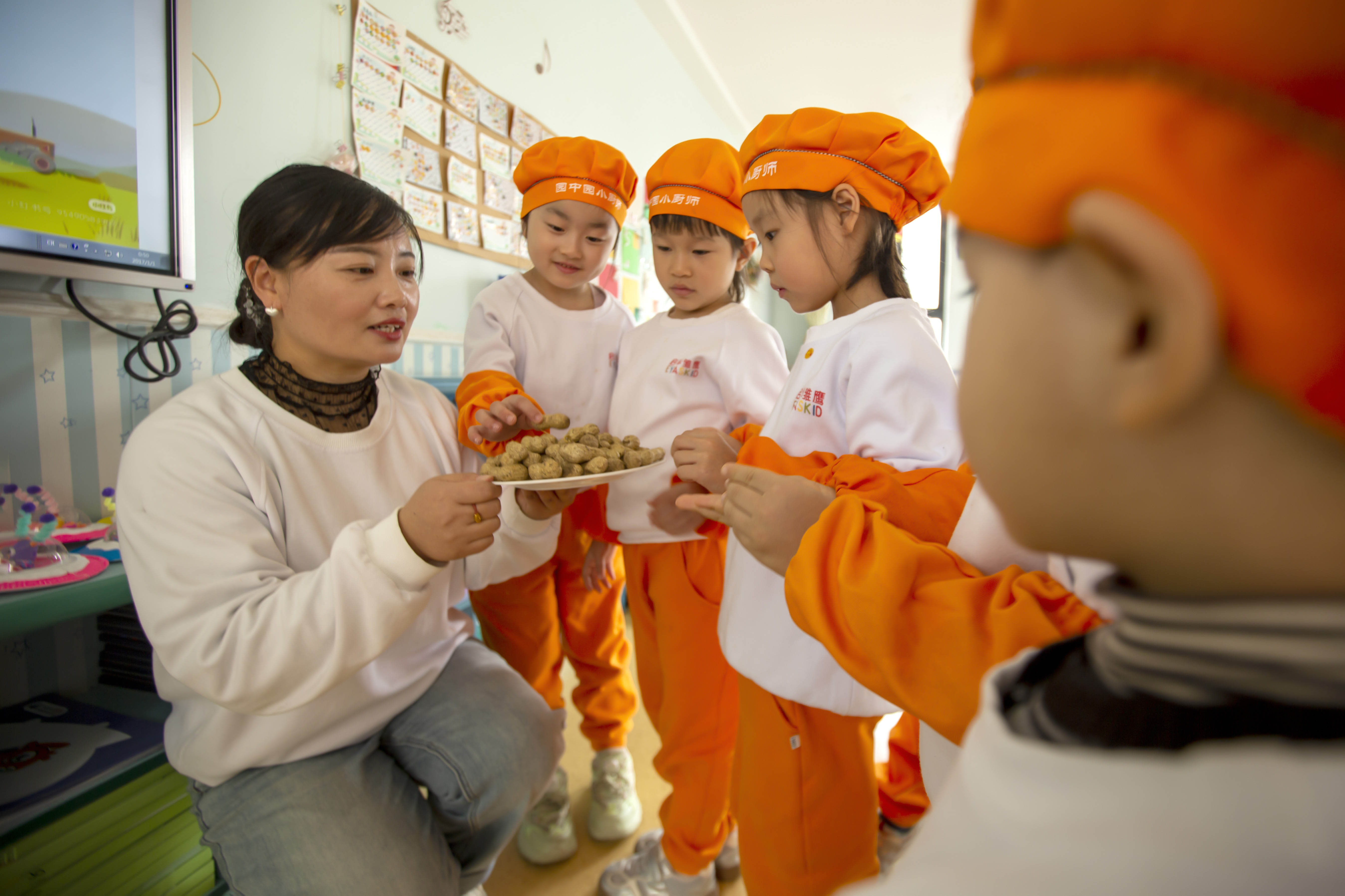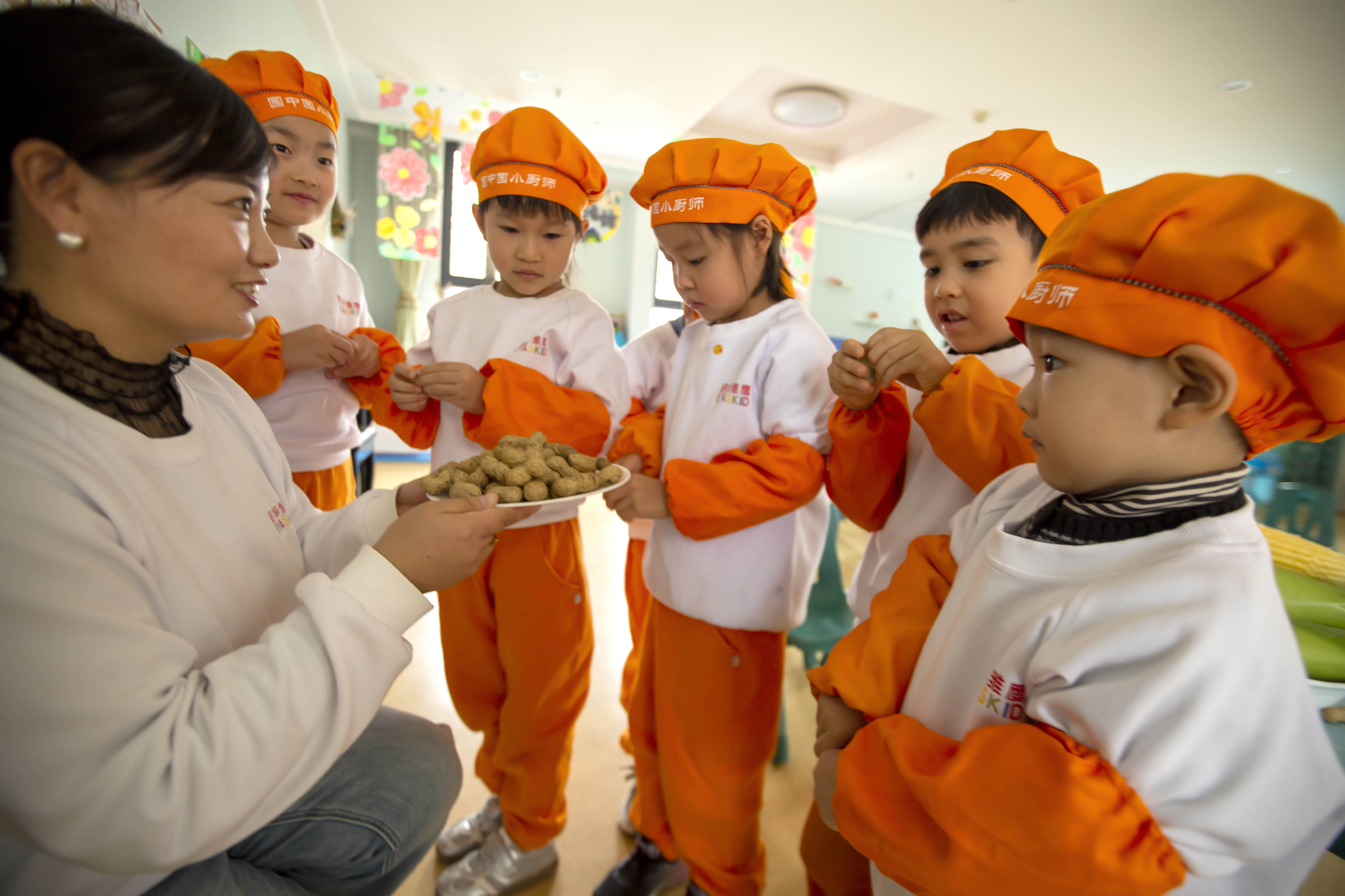园长李老师手托一盘鲜花生,让孩子们充分认识并记住它长什么模样。