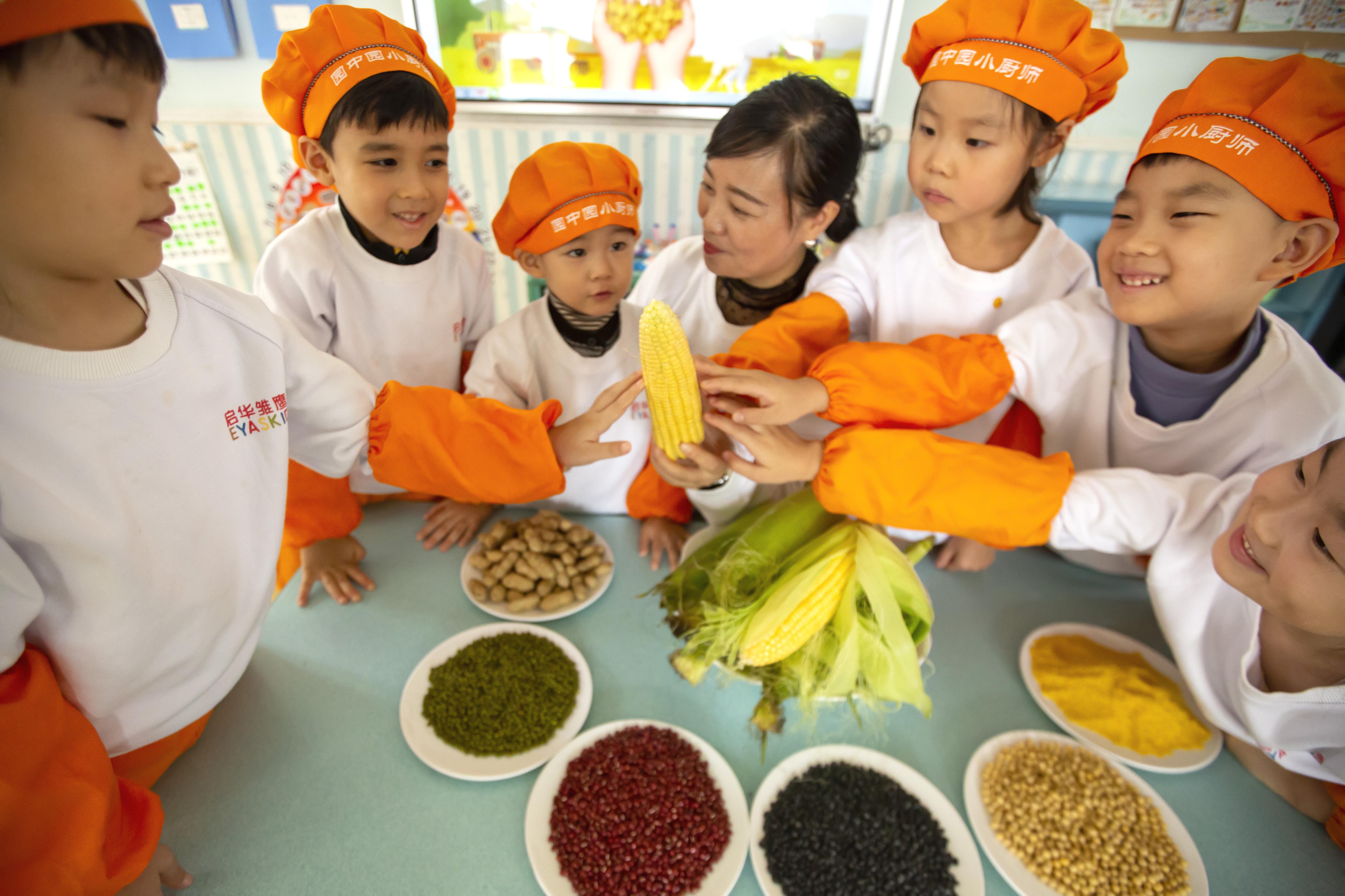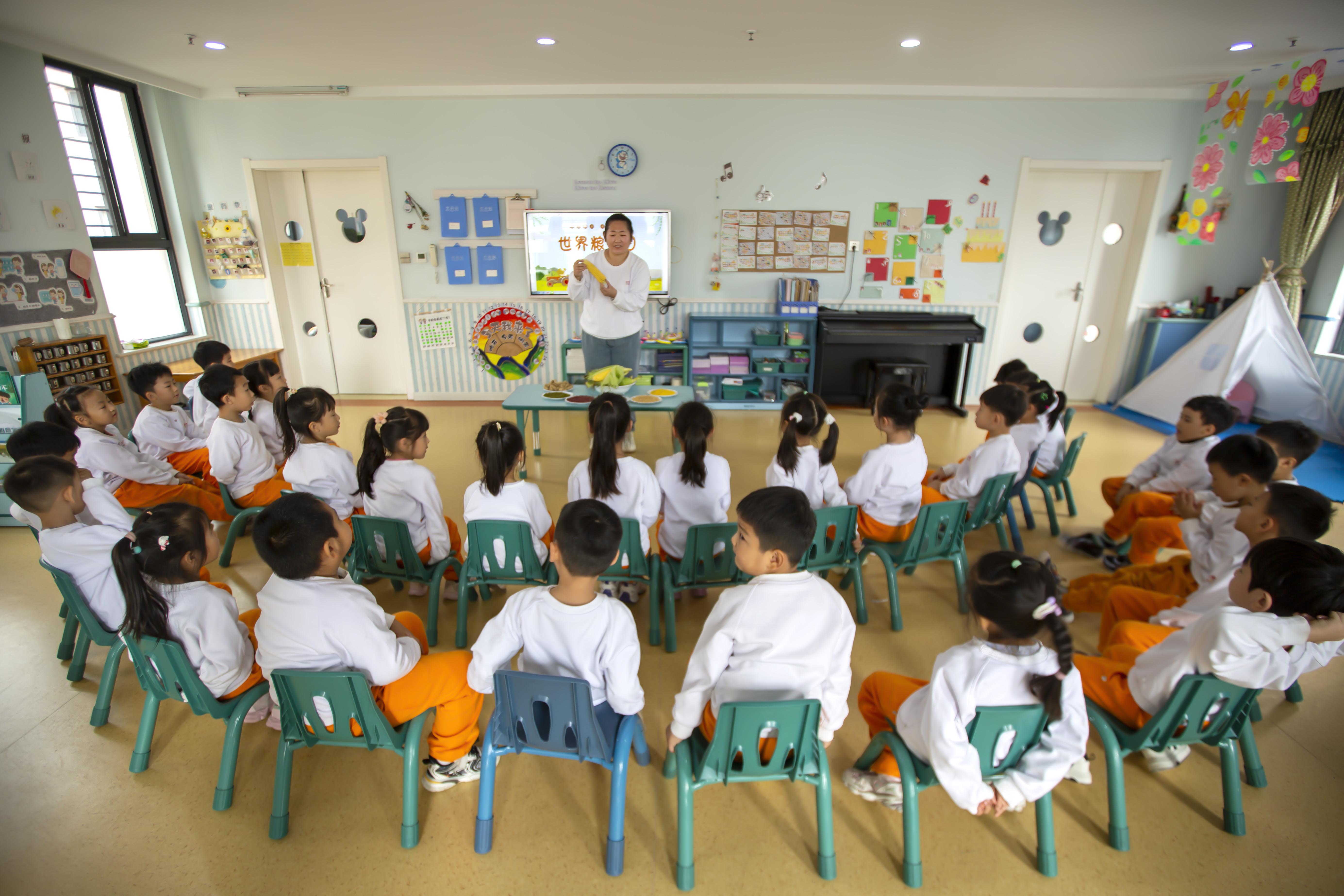 2025年10月15日,河南省安阳市龙安区太行小区街道华秀社区园中园幼儿园,孩子们在认真聆听李红娇老师讲述一个玉米棒和一粒玉米粮的故事。(毕兴世 摄)