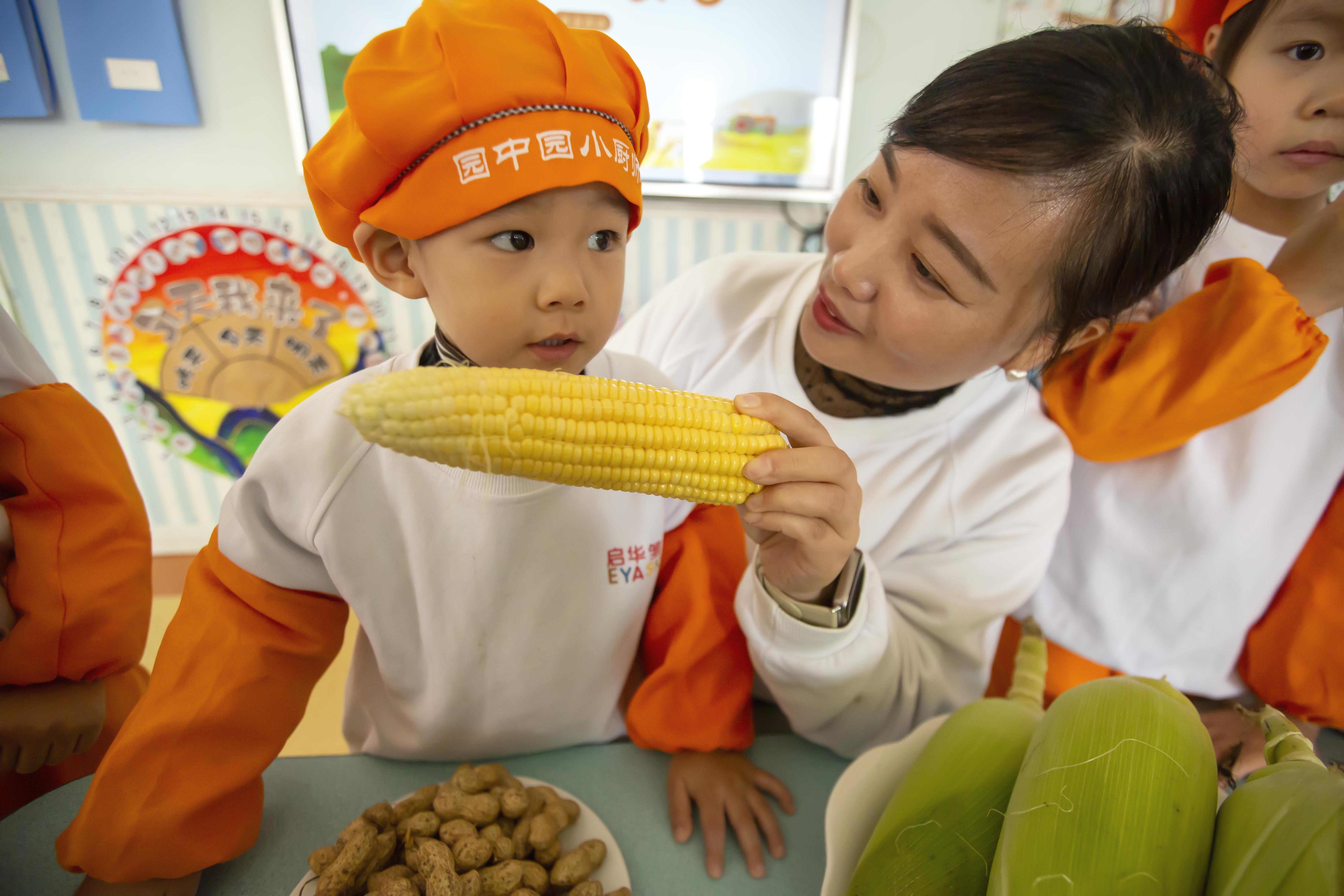 这个今年刚刚四岁、名叫张轶博的小朋友用嗅觉感受玉米棒甜甜的味道。