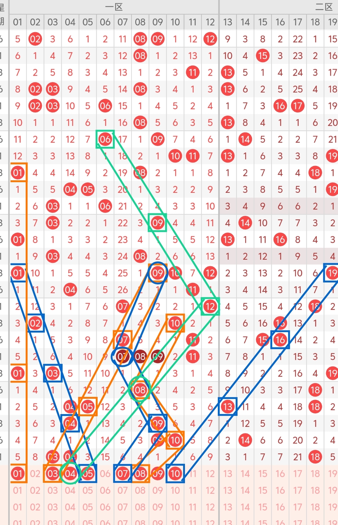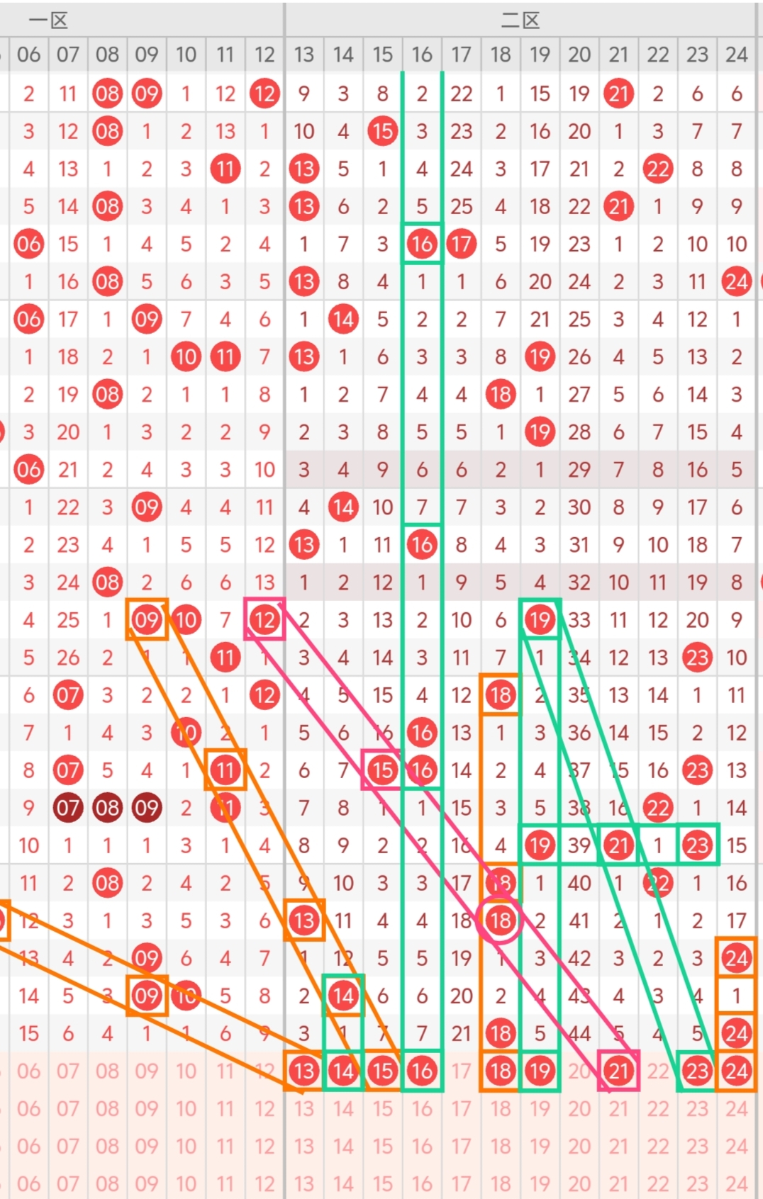 二区推荐13、14、15、16、18、19、21、23、24等九枚号码,其中重点关注13、15、16、19、21等五枚号码;